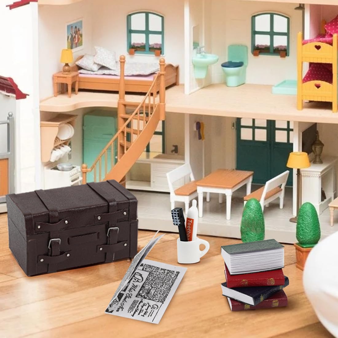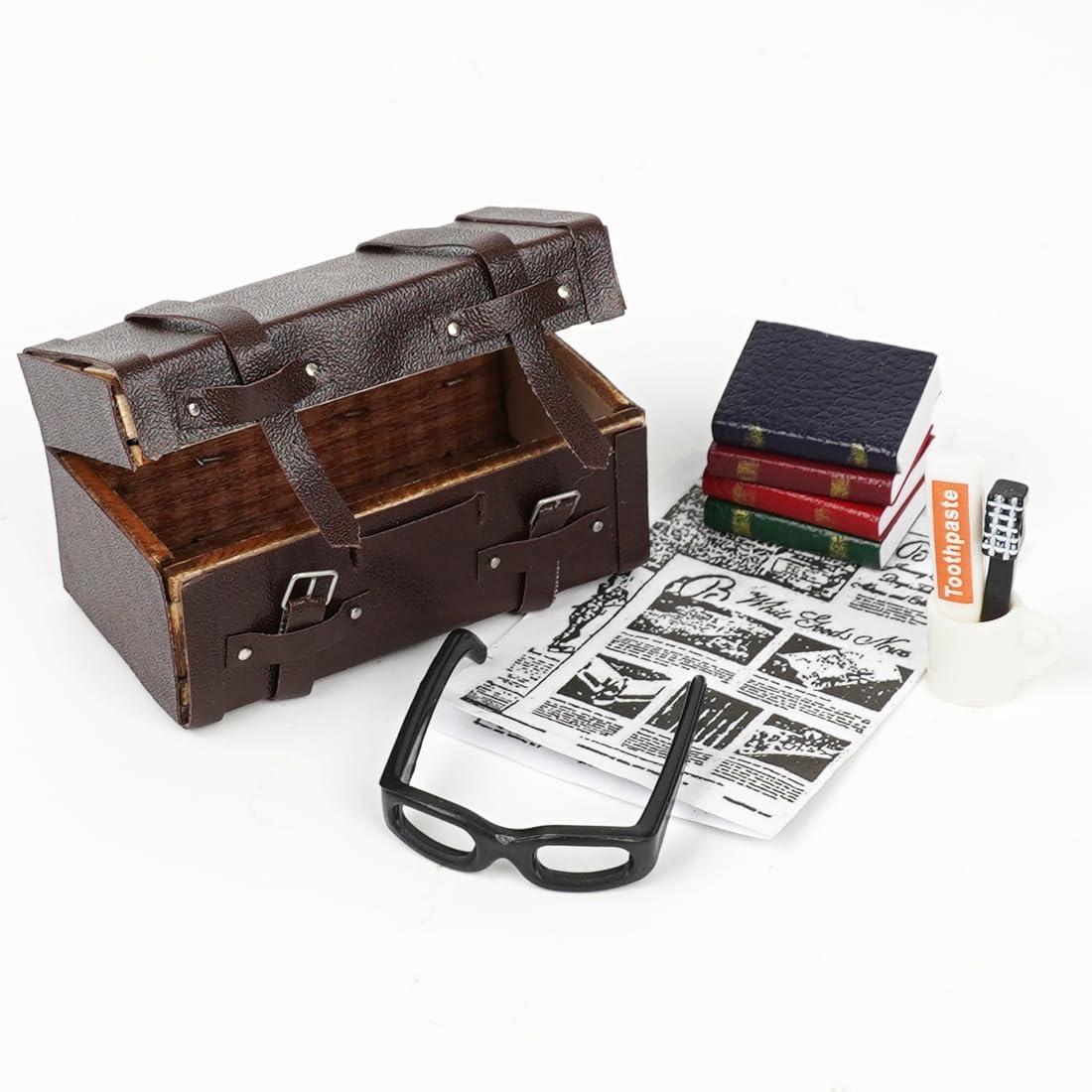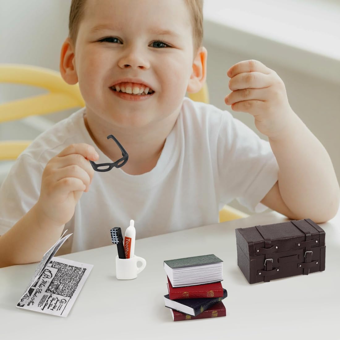 Progiciel list: 10 photographie accessories for dollhouse includes 4 books, 1 x photographie case, 1 x glasses, 1 x photographie toothbrush, 1 x photographie toothpaste, 1 x photographie cup and 1 x newspapers