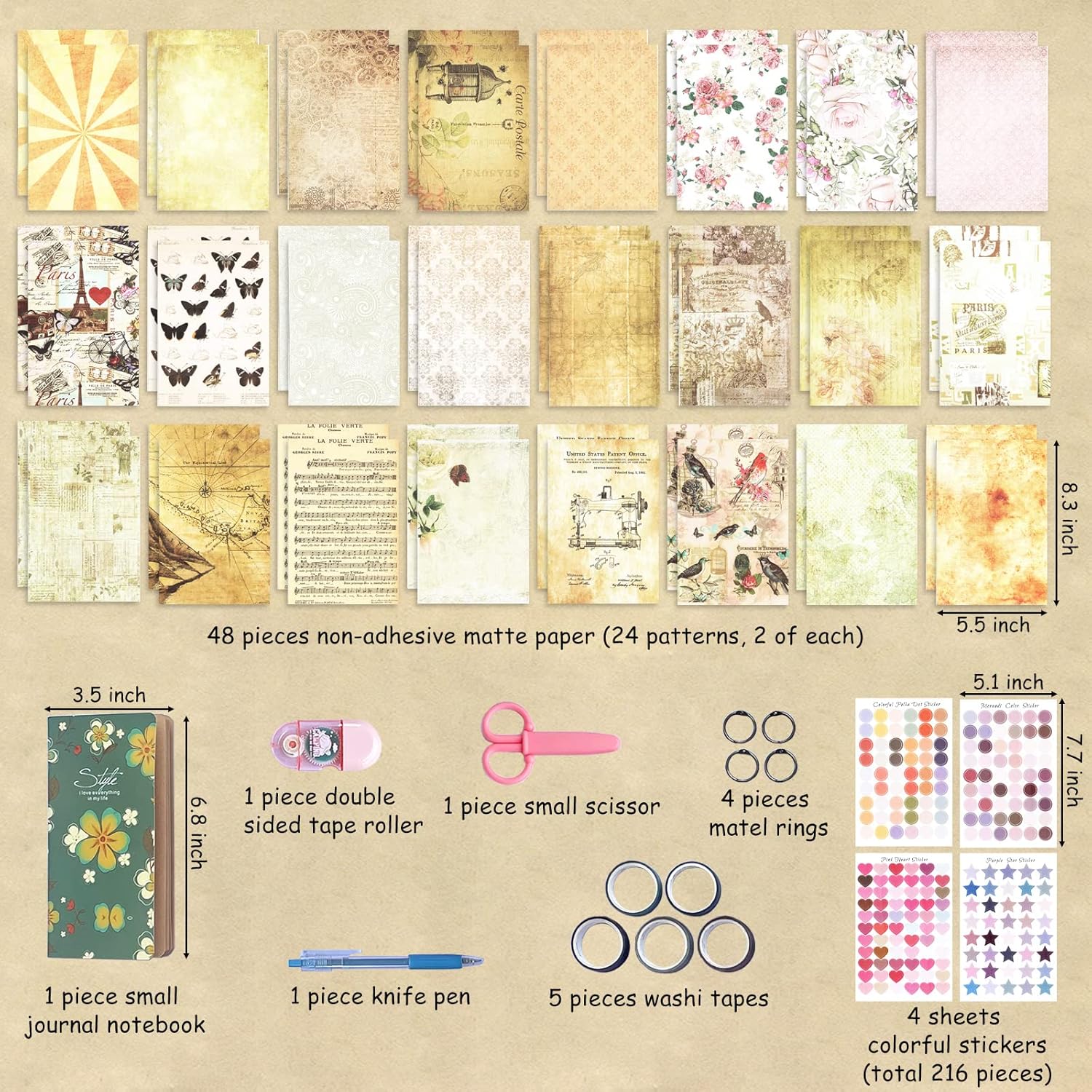 Kit de Scrapbooking: Rassemblement d’Accessoires de Scrapbooking Vintage contient 48 x Pellucide Washi Sticker (1562 fûts, non filandreux), 48 x Non-adhésif Scrapbooking Feuille (24 motifs, 2 de quelque), 4 x Autocollants Colorés (216 fûts), 1 x Chaussette Ticket Agenda, 1 x Stylographe Poignard, 1 x Bande de Rivé Copie Côté, 1 x Bébés Sécateur, 4 x Nickel Anneaux, 5 x Washi Chiquenaude et 1 x Éclatant Ballon.