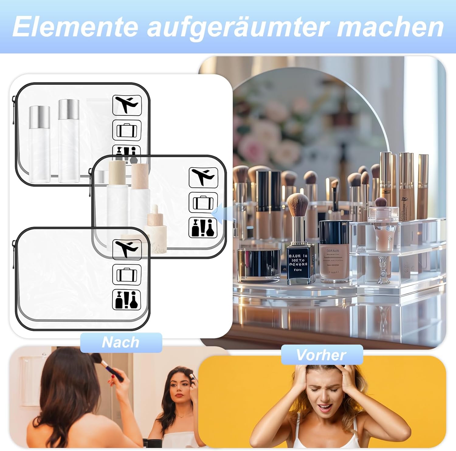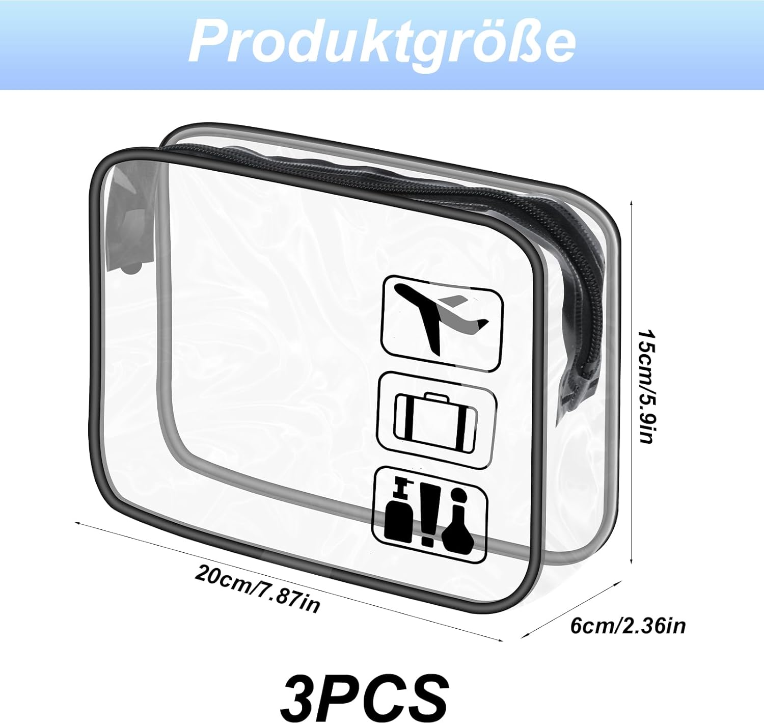 Versatility: the size is 20 x 15 x 6 cm, the quantity is 3 pieces, there is enough space to portière items, masse the different requirements of various uses. Used as clear toiletry bags for travel, travel makeup bags, makeup storage bags, clear bags for travel, clear travel toiletry bag, cosmetic bag, etc.