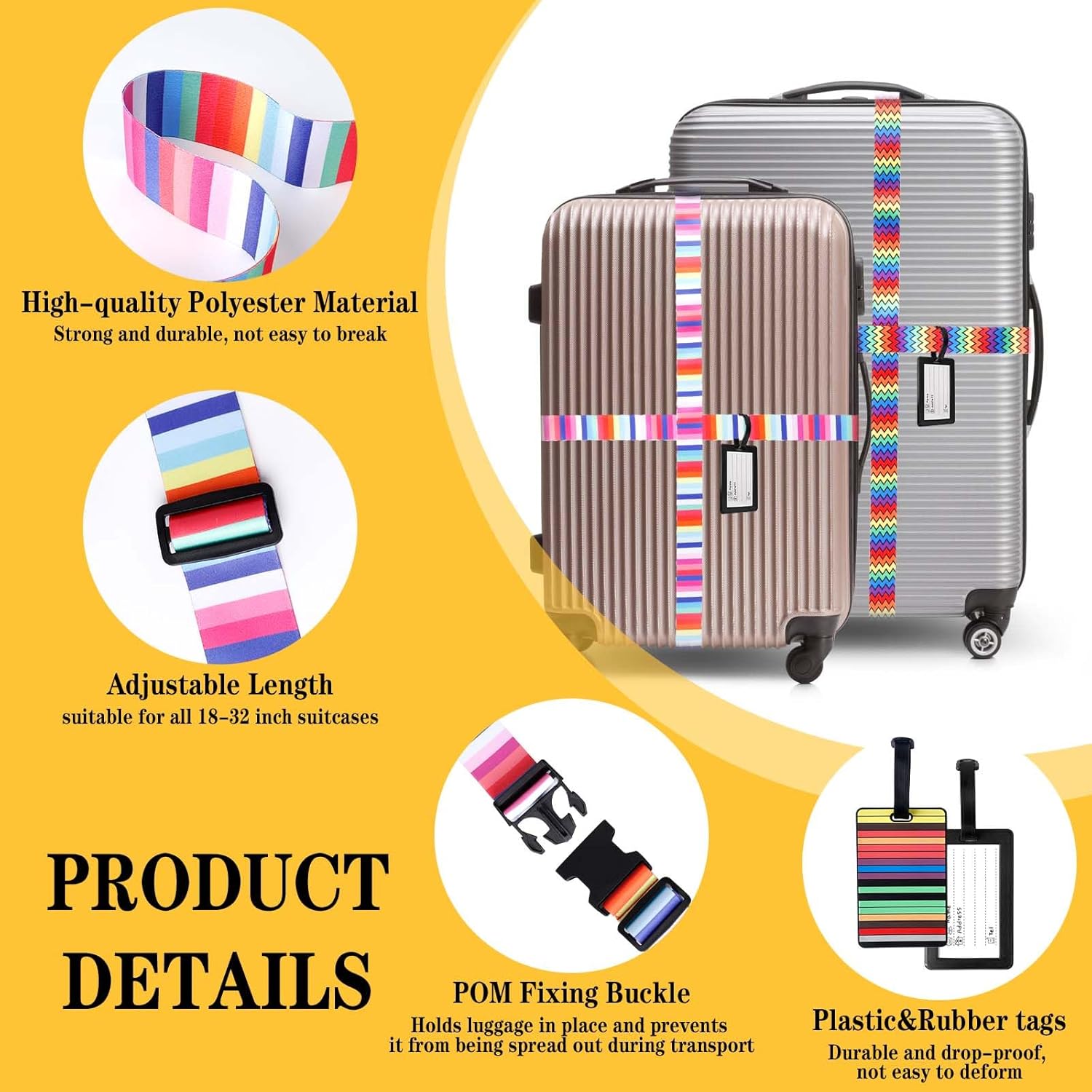 Easy to identify: This is a very stylish and designed luggage belt – one of a kind, with rainbow formé esthétique, bright colors, eye-catching, can make your luggage more beautiful, easy to identify, save your time.