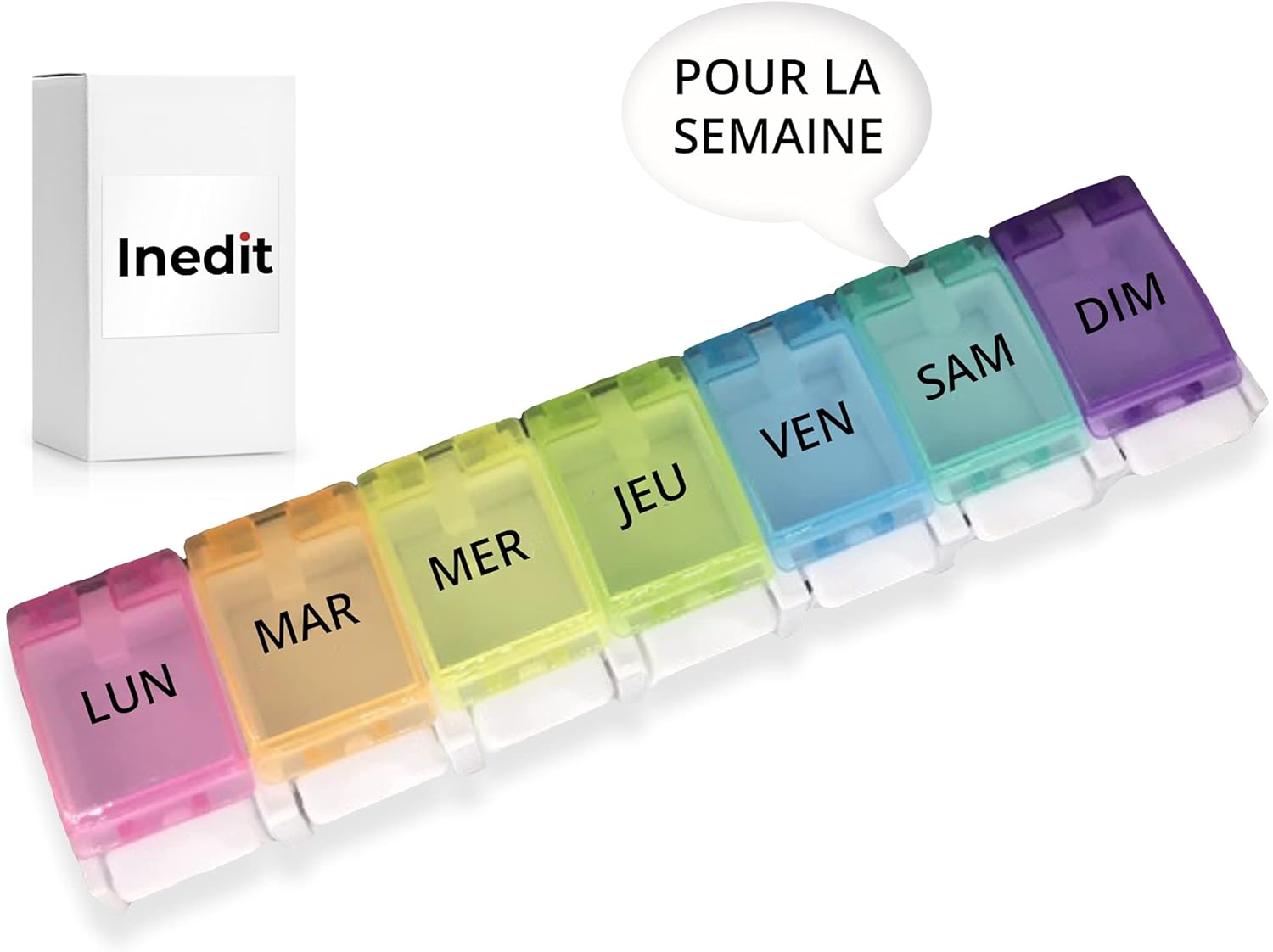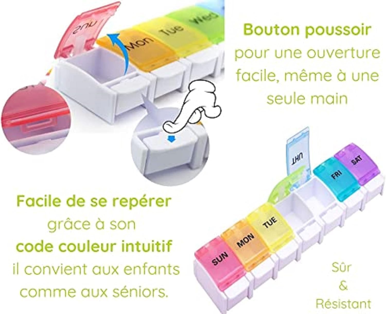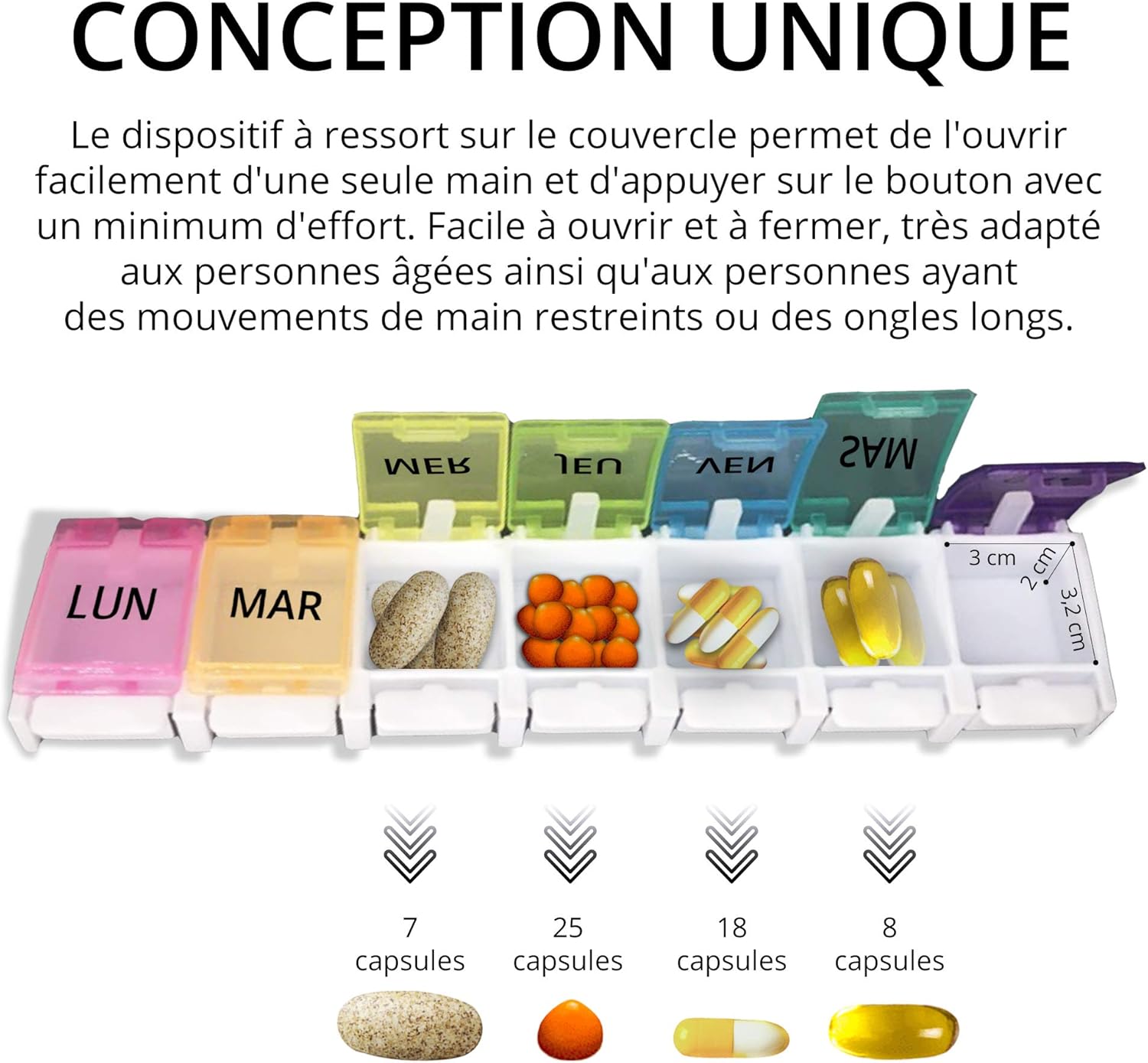 👍 EASY IDENTIFICATION: The 7 compartments are colored differently for each day of the week (1 color per day) and are labeled with the first 3 letters of the day in French, from Monday to Sunday. This pill box is suitable for all ages, from children to seniors, for weekly use. In compte, it is BPA free and 100% food safe, guaranteeing great safety.