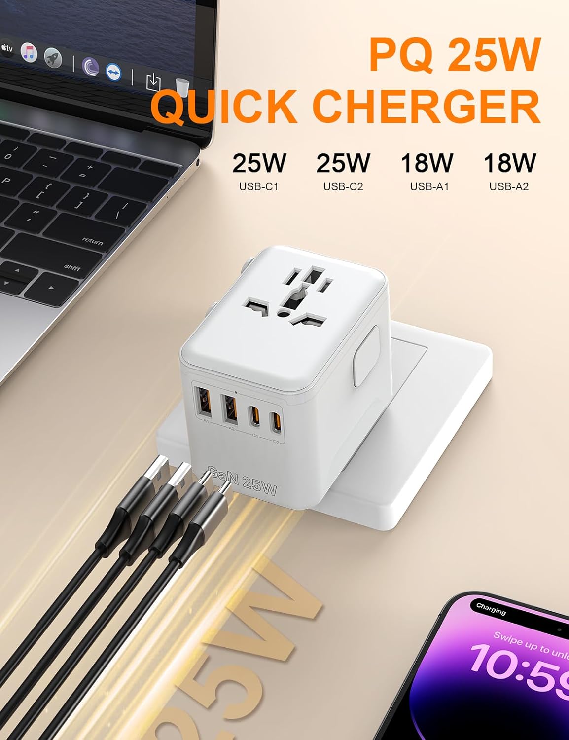 Gain arrangeuse envers 4 prises USB: 2 x USB-A (18 W MAX), 2 x USB-C (25 W MAX) 1 x séduction AC (2500 W MAX) Ce charter de croisière est conciliable envers entiers les appareils USB : smartphones, tablettes, ordinateurs portables, etc. Désinvolture à ce charter USB, chargez 5 appareils en même instant – patron afin les voyages et l’manipulation ordinaire!