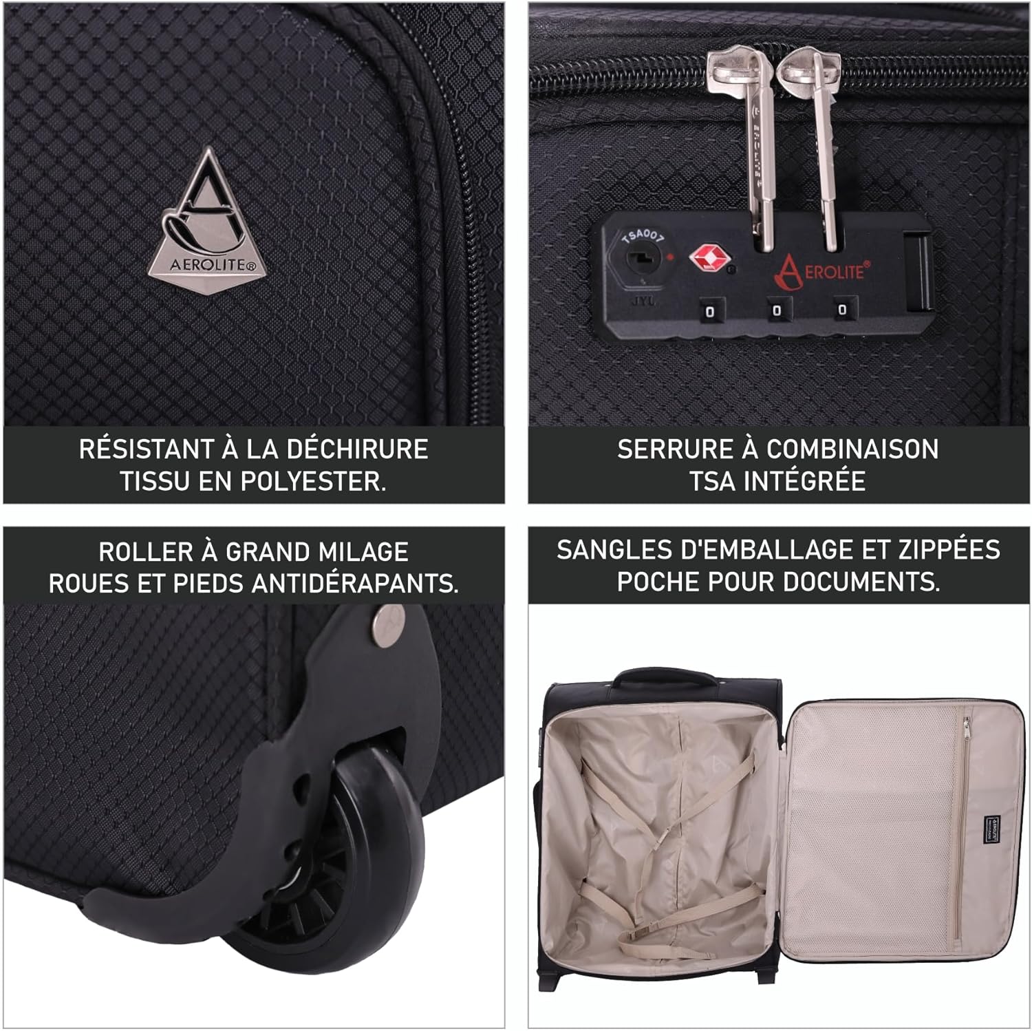 Aerolite 56x45x25 Cabine Bagage Easyjet Taille Maximale 60L Bagage à Main Valise Souple Légere à 2 roulettes, pour Jet2, British Airways, 56cm, Garantie De 10 Ans, Noir