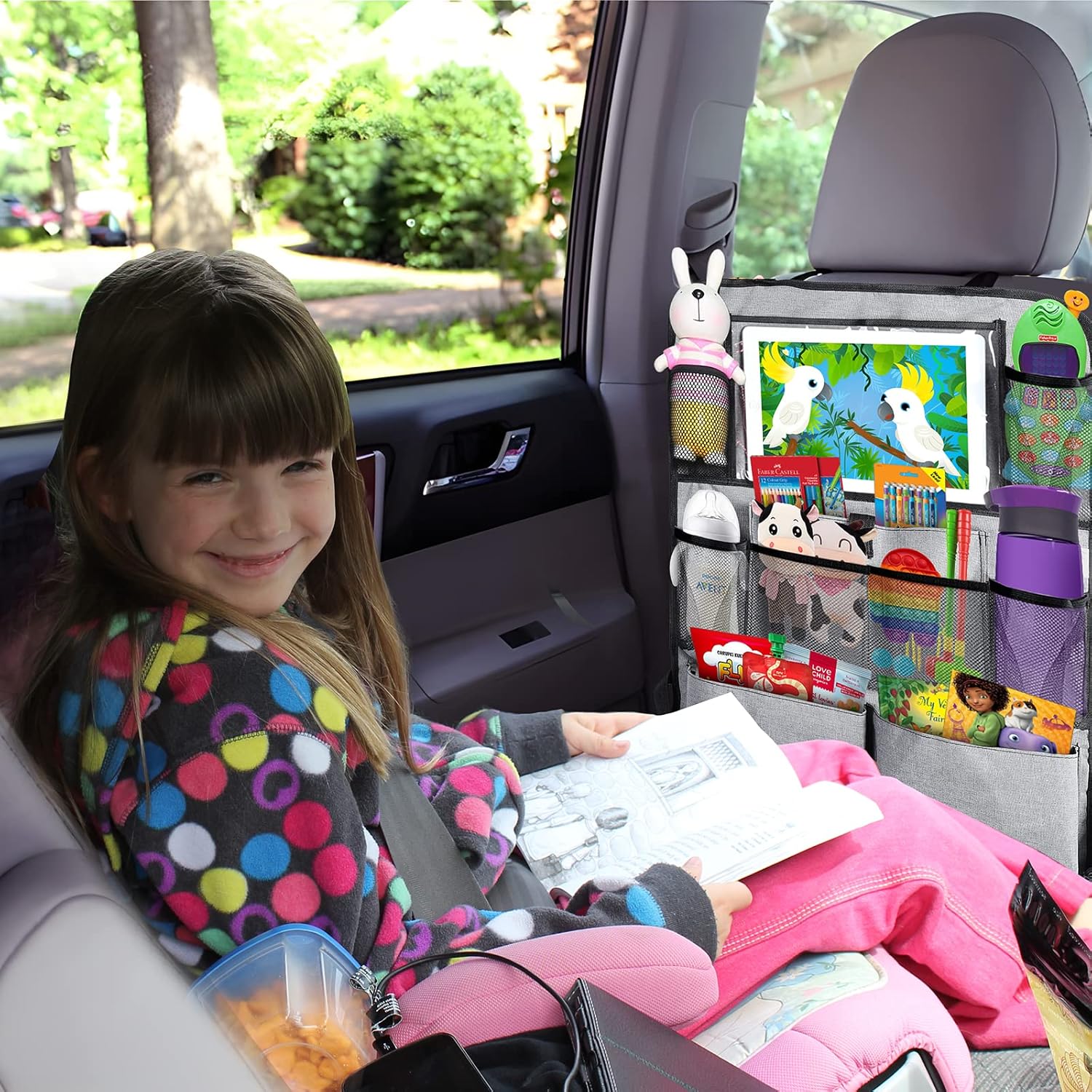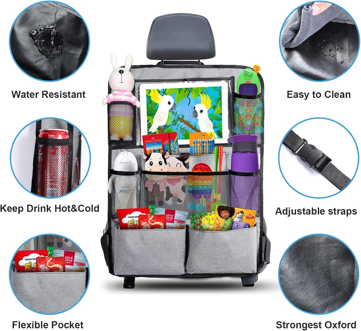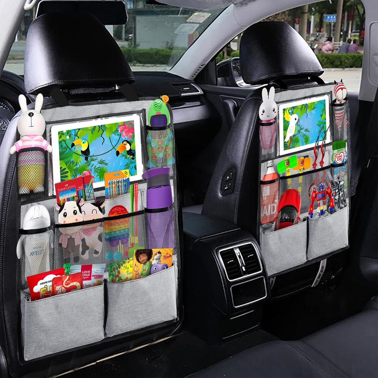 AiQInu Car organizer with plenty of storage space, 9 different compartments for storing various accessories such as hebdomadaires, cutlery, toys, tablets, books etc. A clear tablet sleeve to keep kids busy while driving. Two épanoui openings next to the tablet window provide enough space for the charging cable and headphone cable.