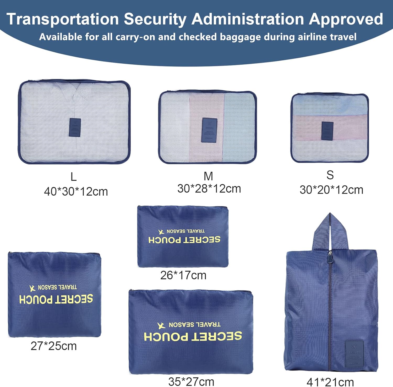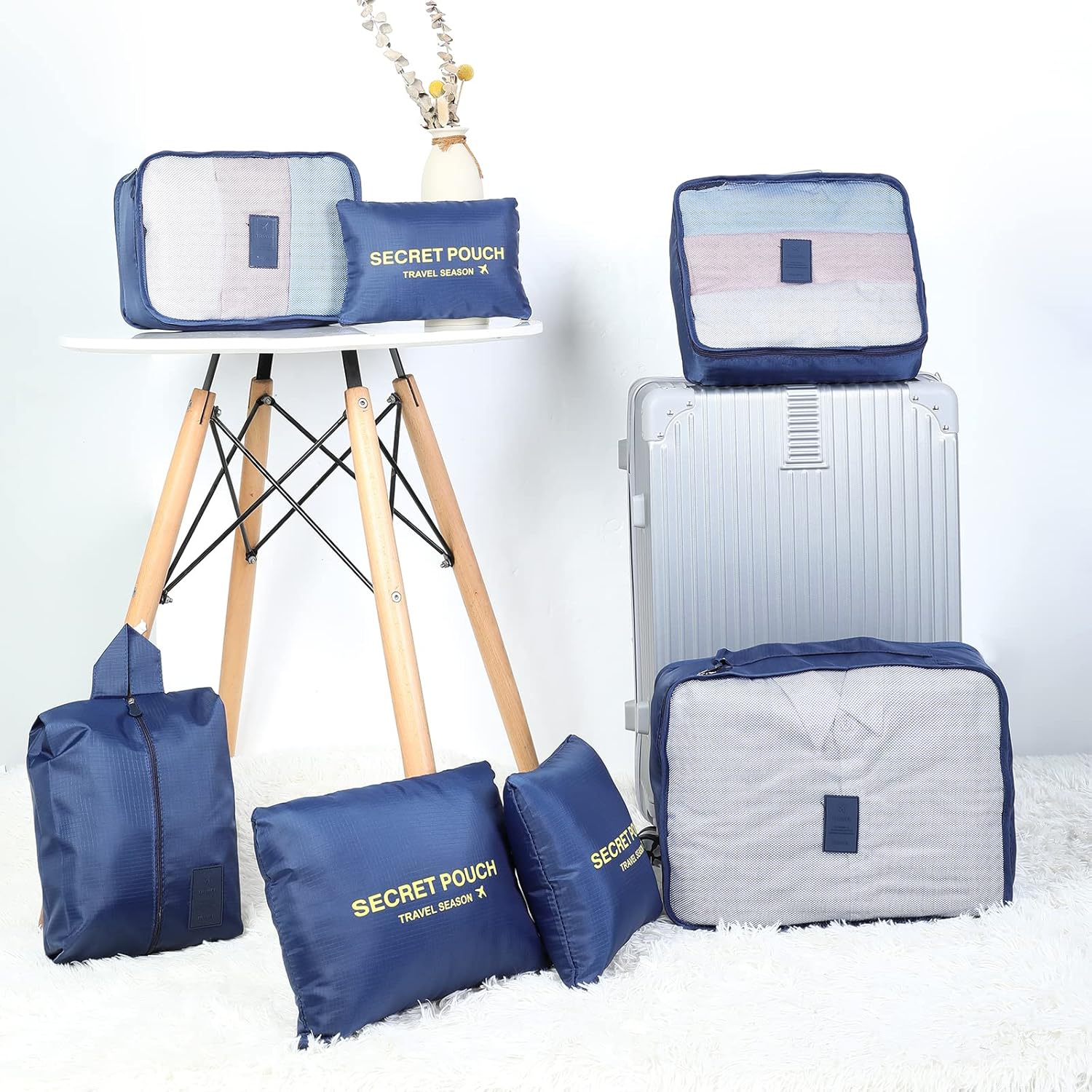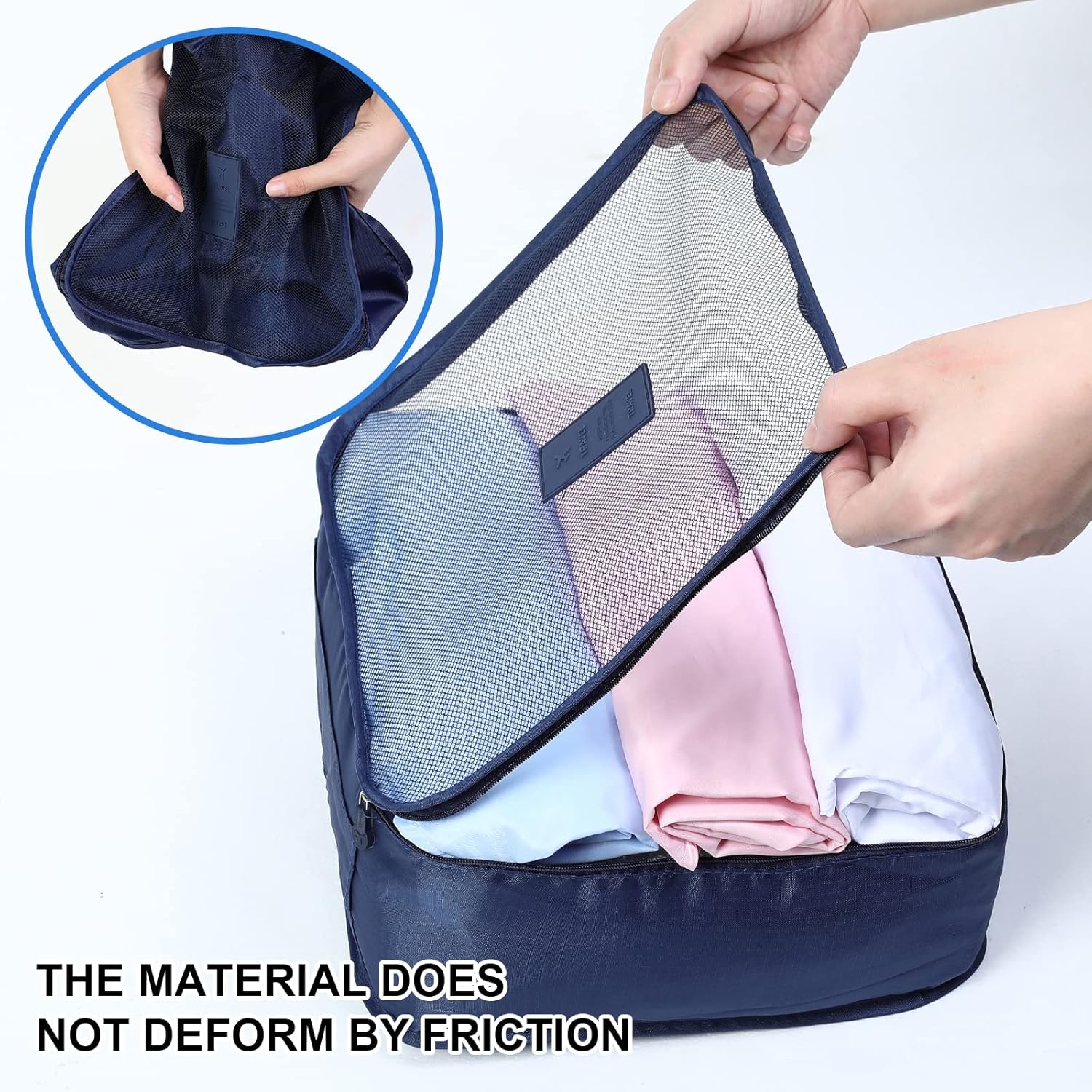 Abondant capacity: contains 3 x storage cubes for clothes, 3 x flat pockets with zip, 1 x shoe bag. You can keep your luggage clean and tidy for an easy and comfortable travel experience.