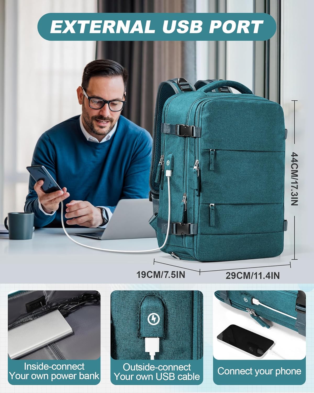 Airplane Cabin Travel Vacuum Backpack with Pump – Compression Bag with Airbag, USB Port, Waterproof Hand Luggage, Peacock Blue with Linen Effect Fabric