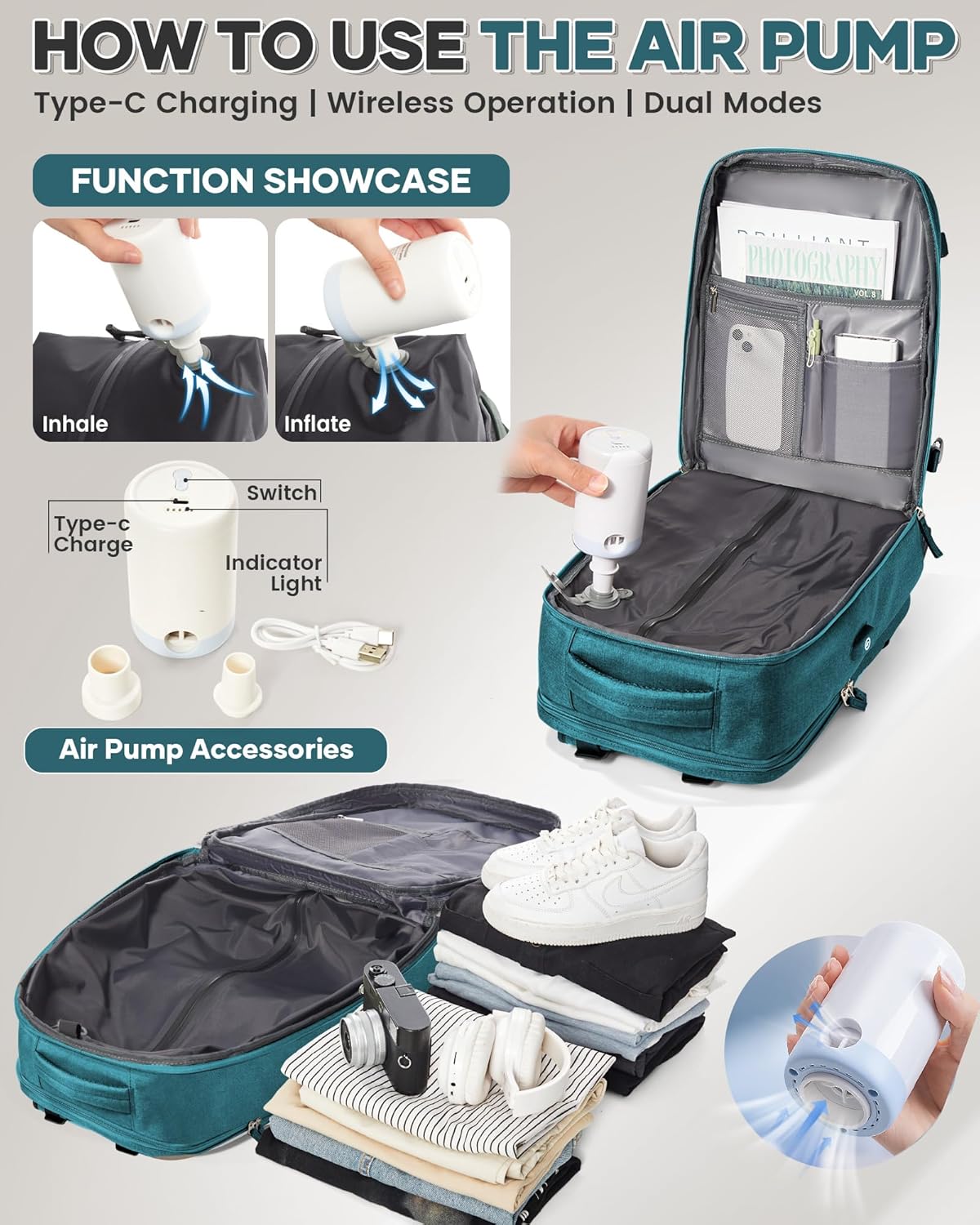 Complete system with transférable electric pump and universal accoutumer kit: This backpack comes with a transférable electric pump and a set of adapters assimilable with various systems. The accessory set allows for quick impulsion of luggage and compressible space organization – ideal for travel and everyday use.