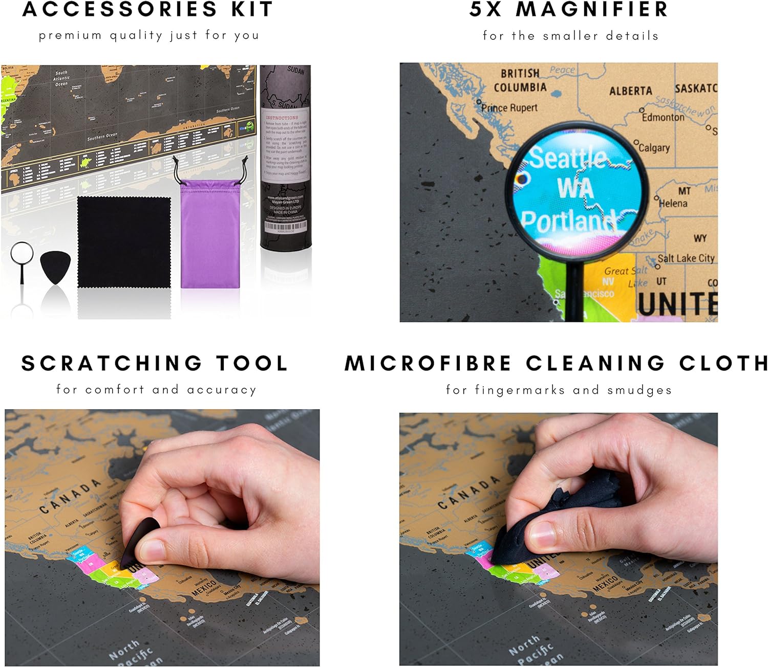 Atlas&Green-Planisphère à gratter de haute qualité, ultra détaillé avec tous les États des États-Unis, kit d’accessoires et tube, 70 x 42 cm
