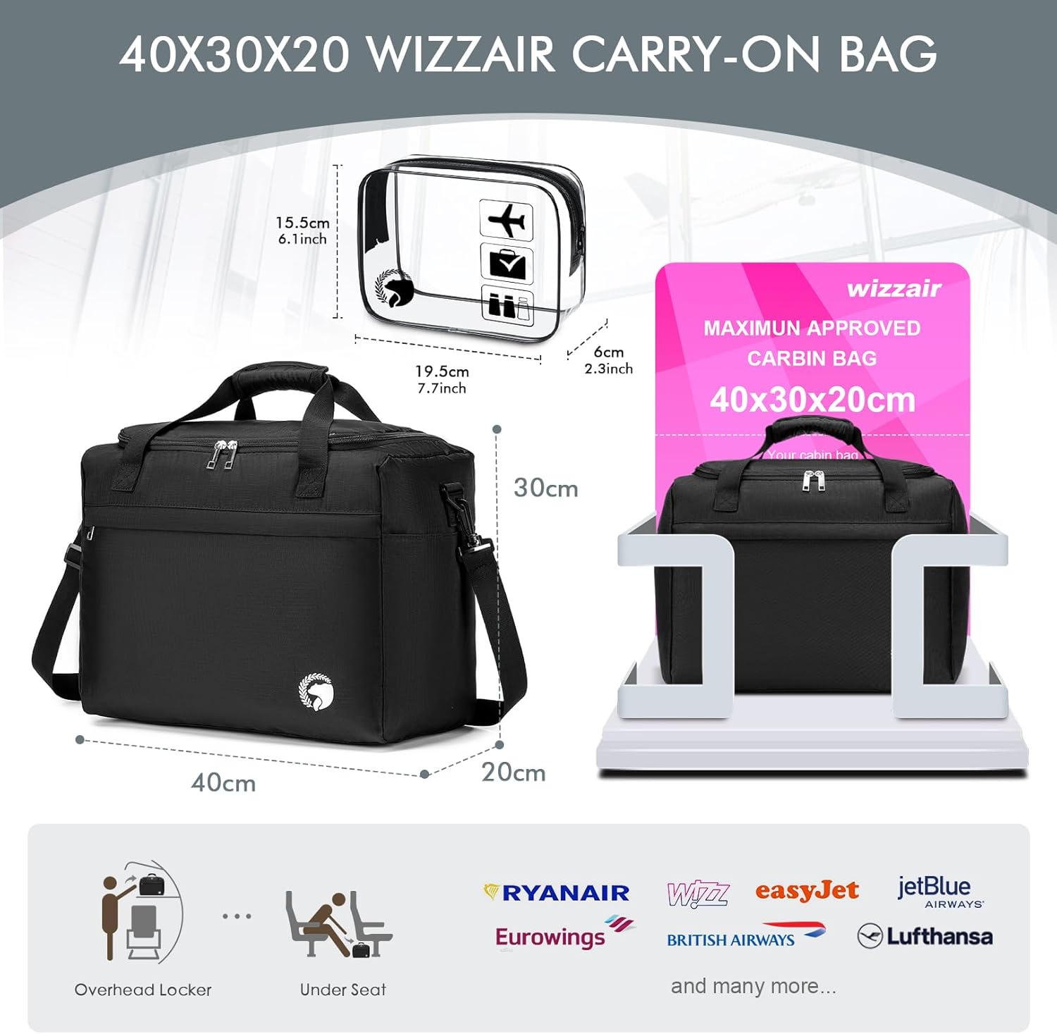 Cabin bag 40 x 30 x 20 cm: The BAGZY travel bag is sized in 40 x 30 x 20 cm/15.7 x 11.8 x 8 inches, it can easily fit into the cabin luggage control box of Wizzair, Volotea and also for easyJet, Lufthansa, flybe, TUI Airport. Ways, KLM etc. Save your travel crédit and no serviteur baggage fees, easily put under the seat or top locker.