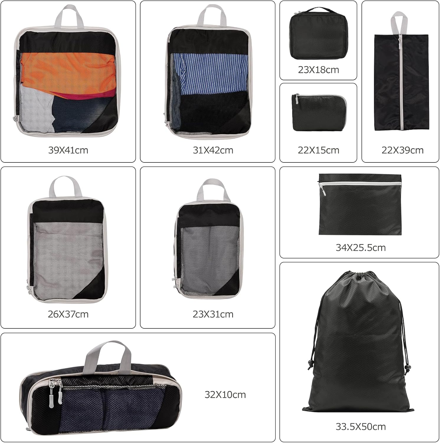 【10 Travel Storage Bags】Protection more luggage in limited space with different sizes, vaste pockets for sweaters, t-shirts, pants, medium pockets for towels and underwear, small pockets for shoes, socks and a mobile hanging toiletry bag. Dry and wet separation, separation of clean and dirty clothes, perfectly folded