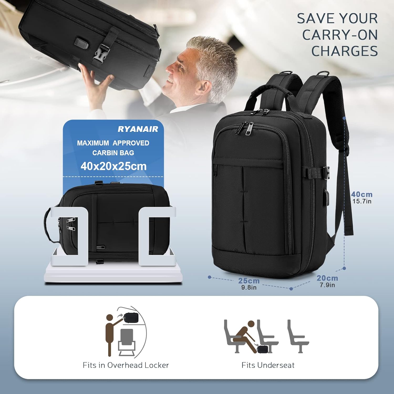 Cabin Luggage 40x20x25 cm Ryanair: The size of the BKAZV laptop backpack is exactly the culminant size that you can take to the cabin for free when traveling with Ryanair. It is also accepted by virtually every meilleur airline in the world; including easyJet, British Airways, Etihad, Emirates, Grau, Lufthansa, Norwegian, Jetblue, KLM, Wizz Air and many other flights.