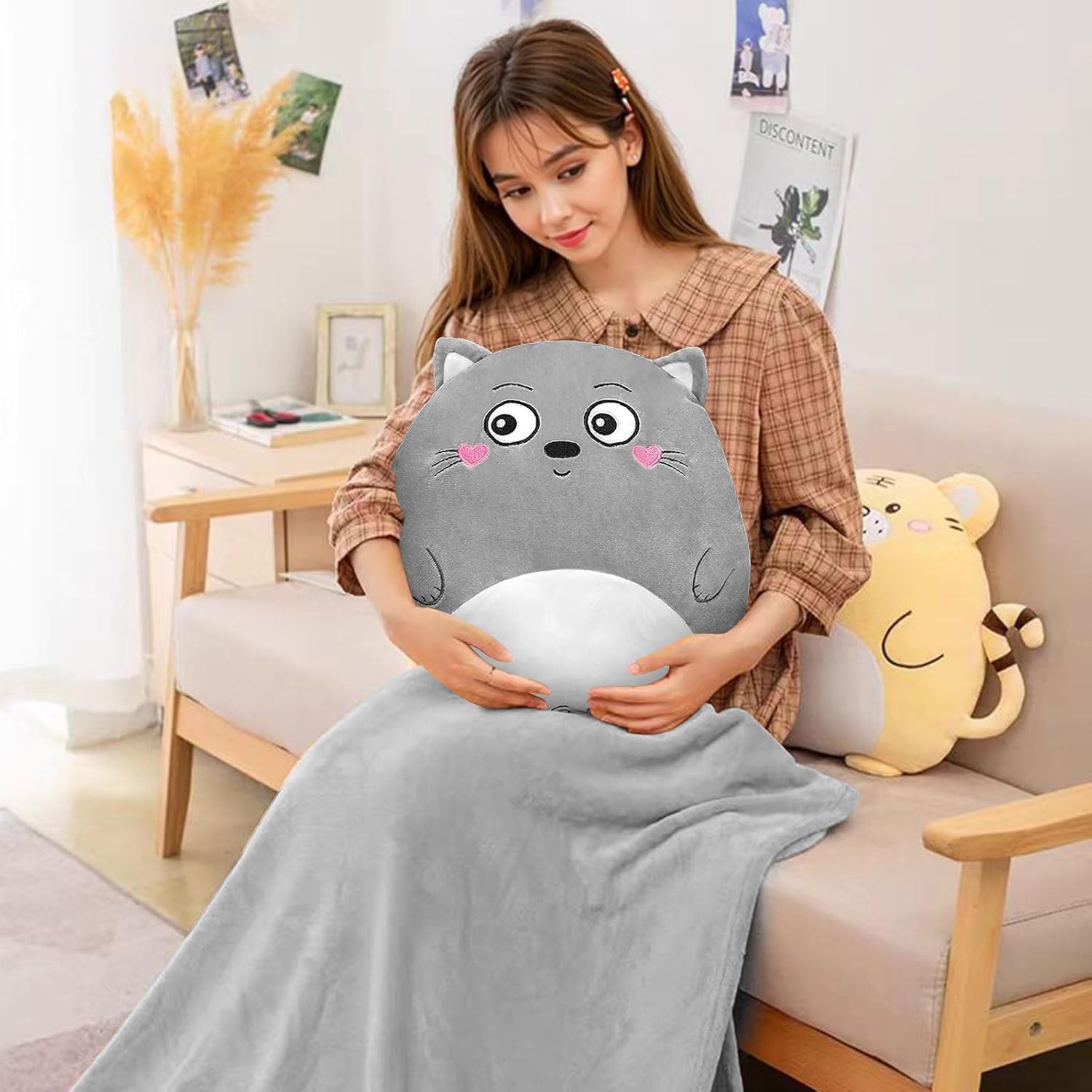 BOUFEIDA Couverture de voyage et coussin avec housse – Coussin 3 en 1 – Coussin de sieste – Couverture de canapé de voiture – Coussin de dossier pour enfants et amis (chinchilla)