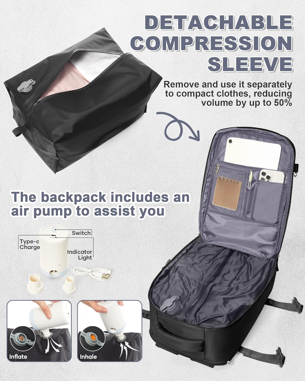 VACUUM PUMPS – The backpack comes with a mobile vide pump that is easy to carry. It also includes various connecting accessories to meet different needs, whether it is to quickly compress your luggage or adjust the packing space, providing great convenience.