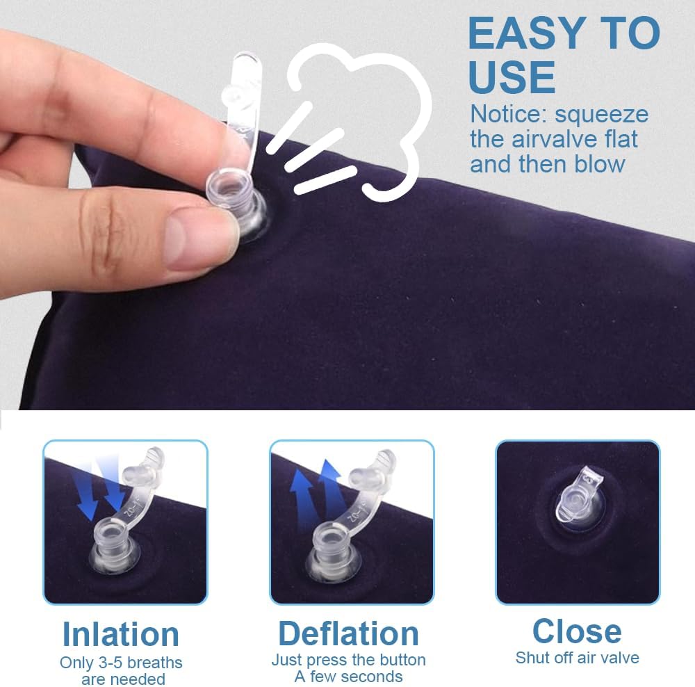 Easy to Inflate This inflatable travel pillow is easy to inflate, the nozzle adopts a reverse anode stylisme, and the air only enters inside, but not by simply blowing air directly inside, and evacuating the air in seconds when you no coudoyer need it.