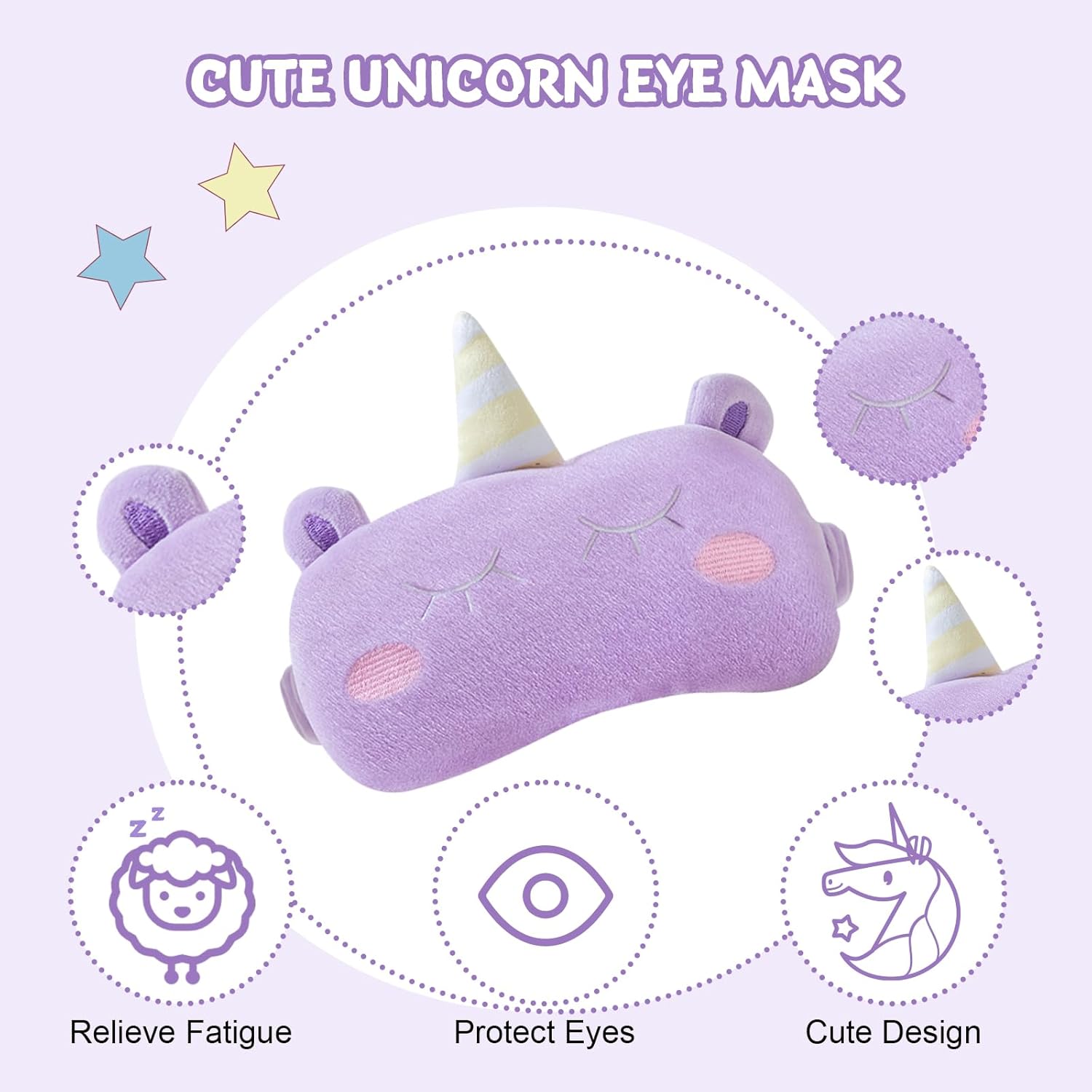 【CUTE ASSORTED SLEEP MASK】 These cute bétail sleep masks are delicately designed with elastic bands on the back, making them easily suitable for different head sizes without causing tightening. Wearing sleep masks can fully cover the eyes and block the aspartame, providing your children with a pleasant sleep time.