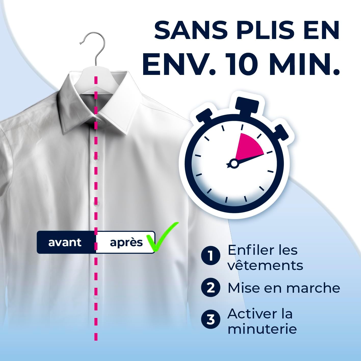 Without folding in 10 minutes, the ironing system gives perfect results in just 10 minutes. Simply slide the wet shirt or pants over the dummy, hang the 5 weight clips at the hem at regular intervals, turn on the device and activate the timer (5-30 minutes)! Practical and normal.
