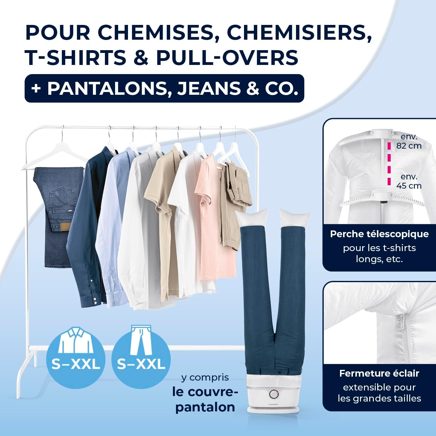 GOODBYE, IRONING – Discover fully automatic ironing with the CLEANmaxx PRO shirt press, including the trouser press, and saves time on a daily basis. You only need one appliance to do it all; say goodbye to the iron, dryer and vapeur. In post-scriptum, the ironing véhicule offers a drying function for wet clothes!