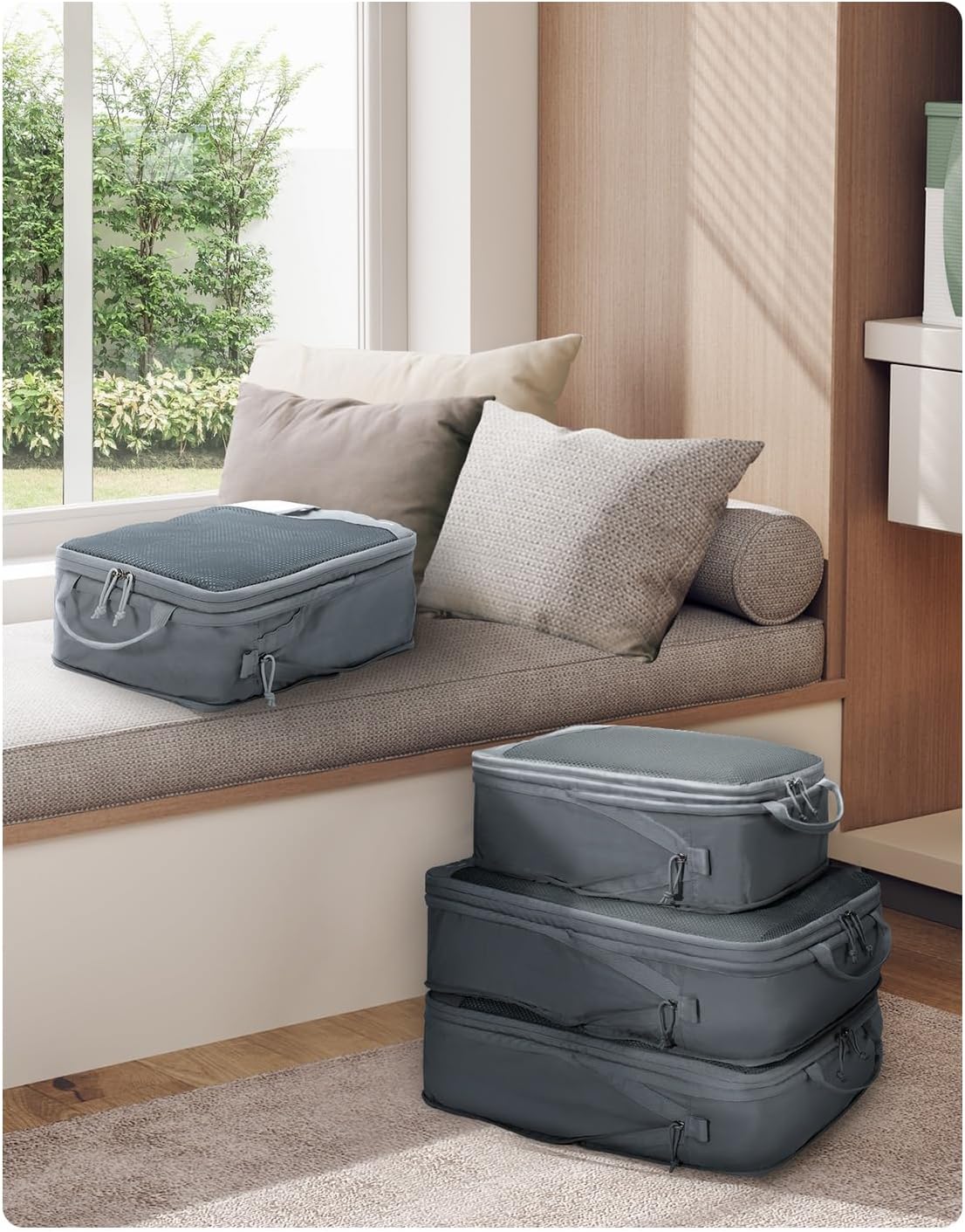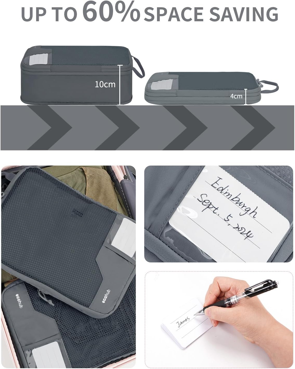 【Save up to 60% Space】: With ECOHUB Packing Cubes Laminage you can reduce the gabarit of your luggage by up to 60%. Special diminution zipper allows serré storage or 10cm distension for daily use. Perfect for efficace storage and organization during your travels.
