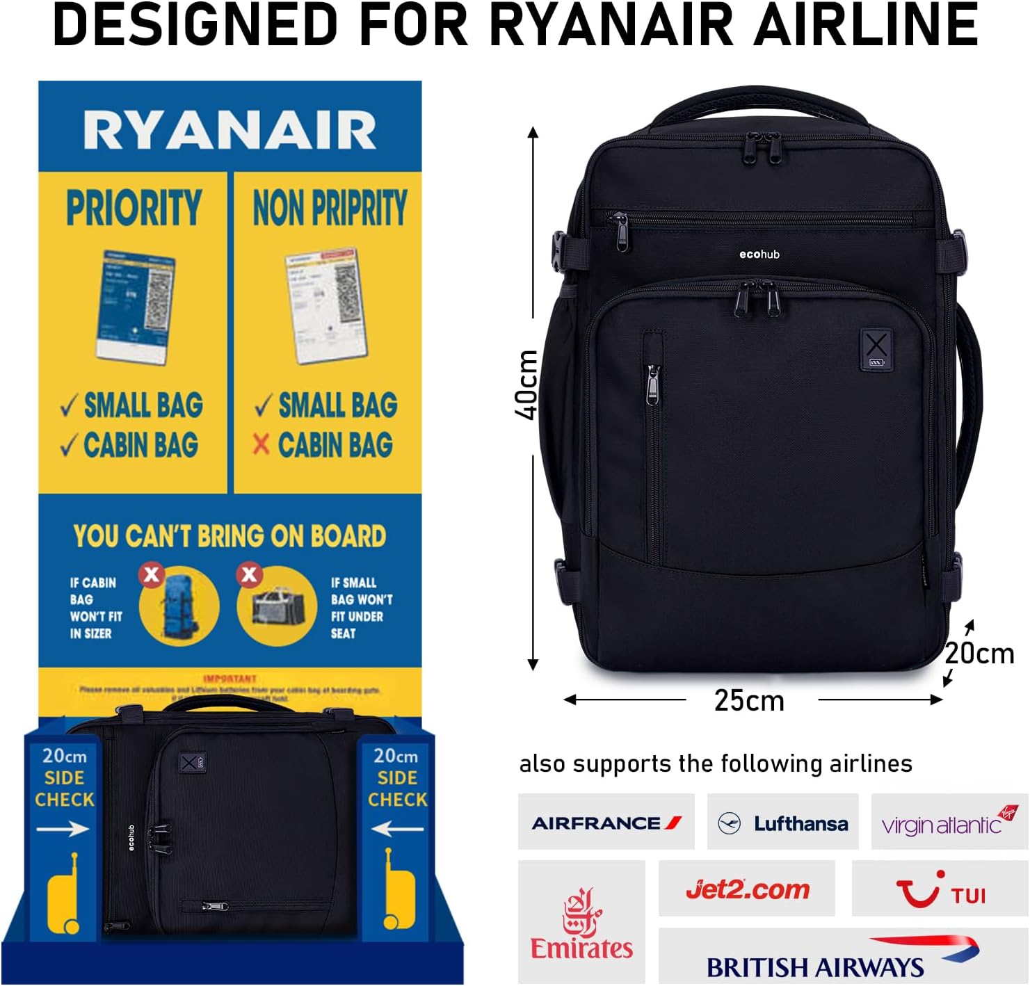 【DIMENSIONS AND CAPACITIES】ECOHUB balle à la main luggage fits the extremum baggage allowance for Ryanair flights. The travel bag under the seat measures 40x20x25cm. With a capacity of 20L, its weight is only 570g. In calcul to Ryanair, the bag is also perfect for Easyjet, British Airways, Etihad, Emirates, etc.