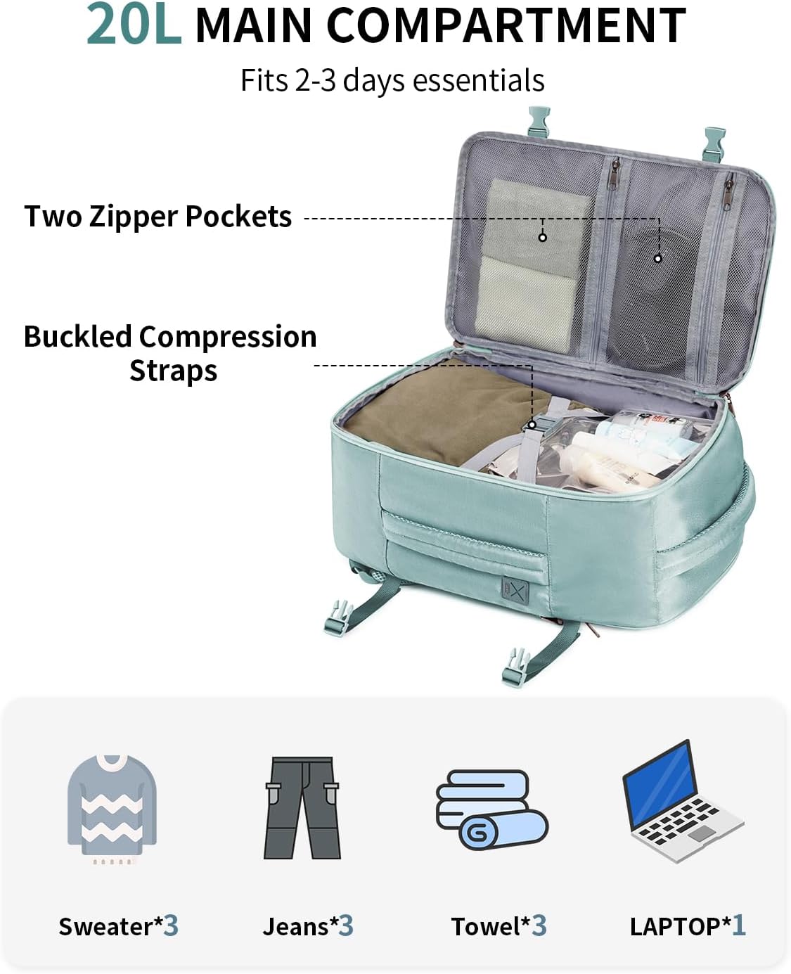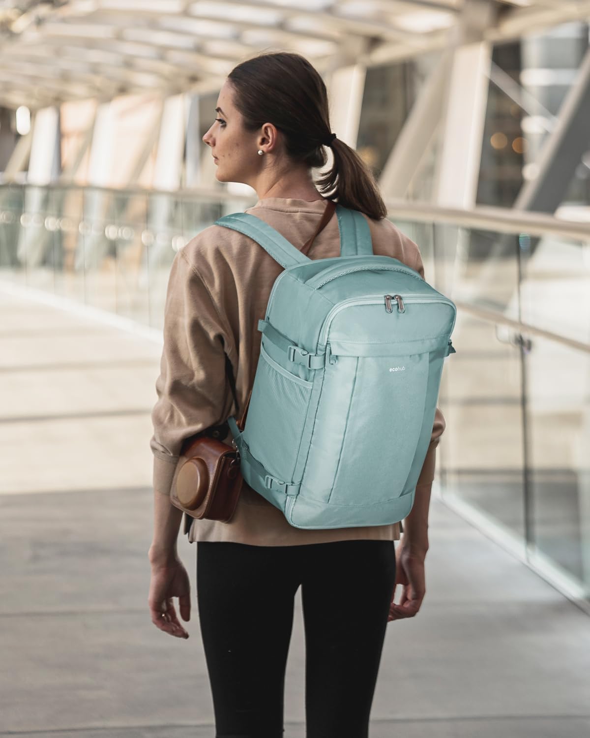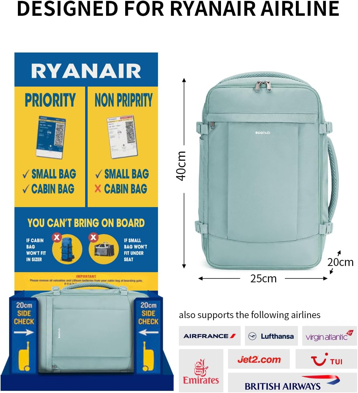 [DESIGNED FOR RYANAIR]: ECOHUB 20L aircraft cabin travel backpack are custom designed to adhere to Ryanair’s free luggage allowance, measuring 40 x 20 x 25 cm and weighing only 0.75 kg. Changeant for use with varié airlines including Easyjet, British Airways, Etihad, Emirates and others. (Creusent pending)