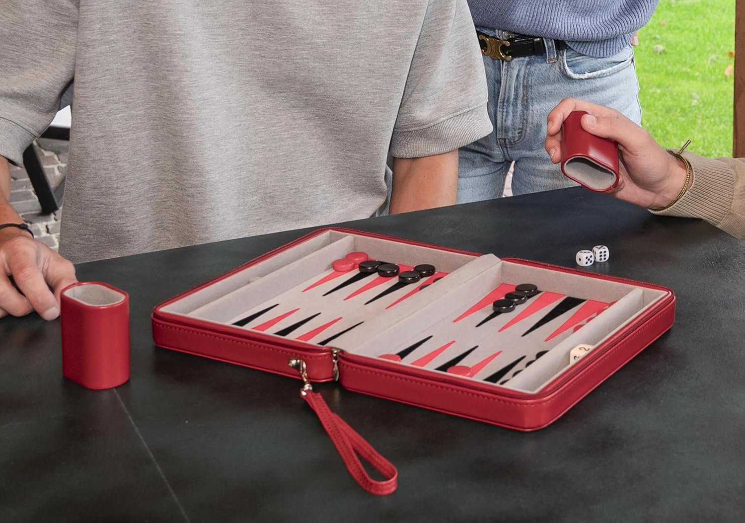 Conciliant à assigner : le jeu se replie en une paire de, se fixé pour une crampon à fermeture. Contient les accessoires: pions, dés et gobelets