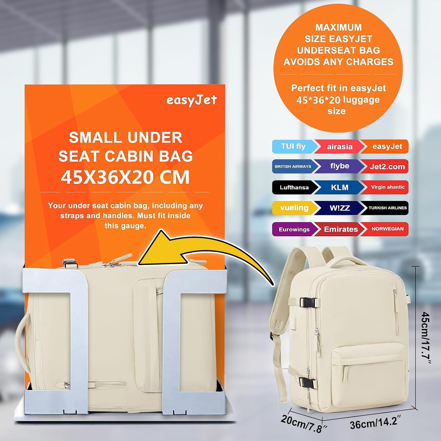 CABIN BAG FOR EASYJET: The size of this travel backpack is 45x36x20CM, meets the Easyjet handball luggage range: 45x36x20CM. And it can be opened 180° like a suitcase to quickly pass airport security checks, and can be placed in the top compartment and under the seat.