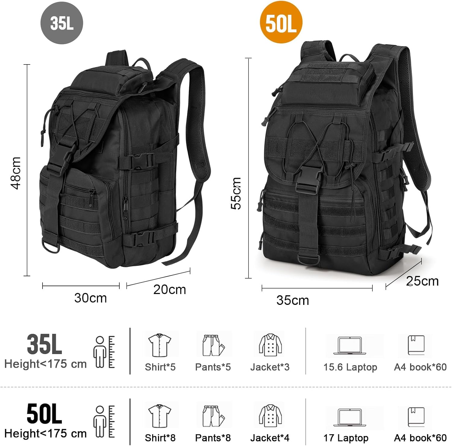 Béant capacity military backpack: Dimensions: 55 x 25 x 35 cm (length x width x height). Capacity: 50L Made of high density 700D oxford fabric, étanche and immortelle, providing a clean and dry environment for your outdoor equipment.
