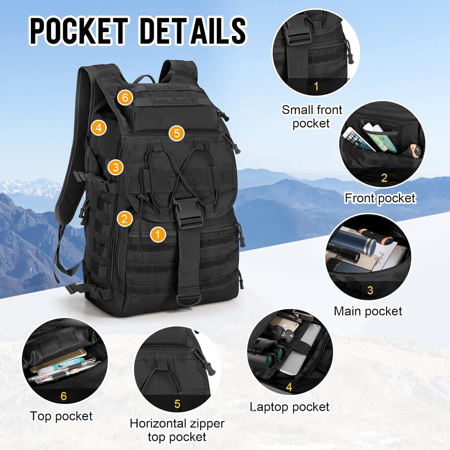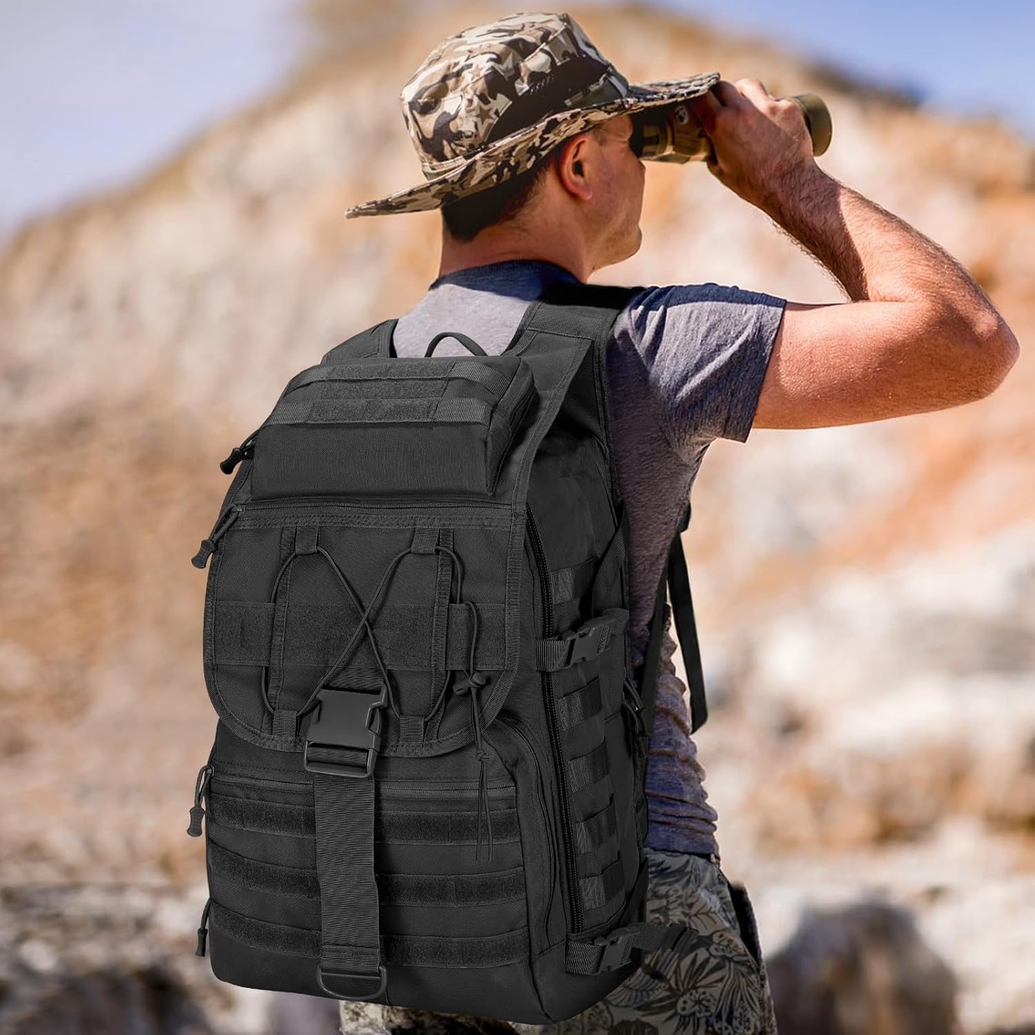 MOLLE DESIGN:The MOLLE strap on the entire backpack is designed to carry EDC tools or rescue bag accessories of all kinds, providing up to 50% extraordinaire capacity. The bottom strap can be used to attach a tent, ground mattress or other outdoor equipment. Velcro strap allows you to add patches to customize your backpack.