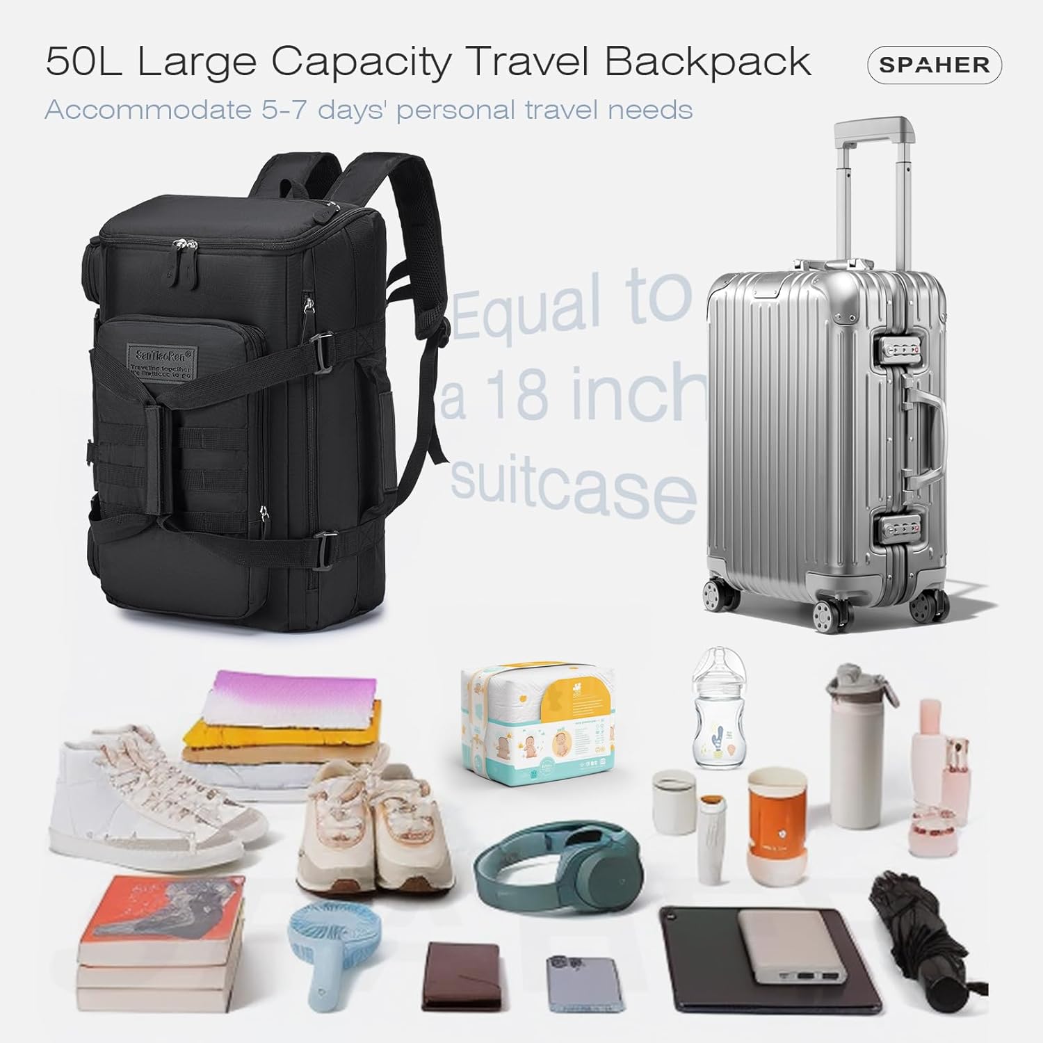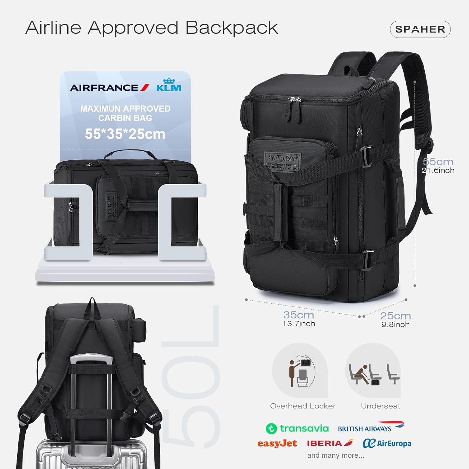 SPAHER 50L Military Tactical Travel Hiking Backpack 55 x 35 x 25 cm Luggage Cabin Air France KLM Backpack Cabin Airplane Large Women Men Waterproof Hand Luggage for Trekking Sport Camping