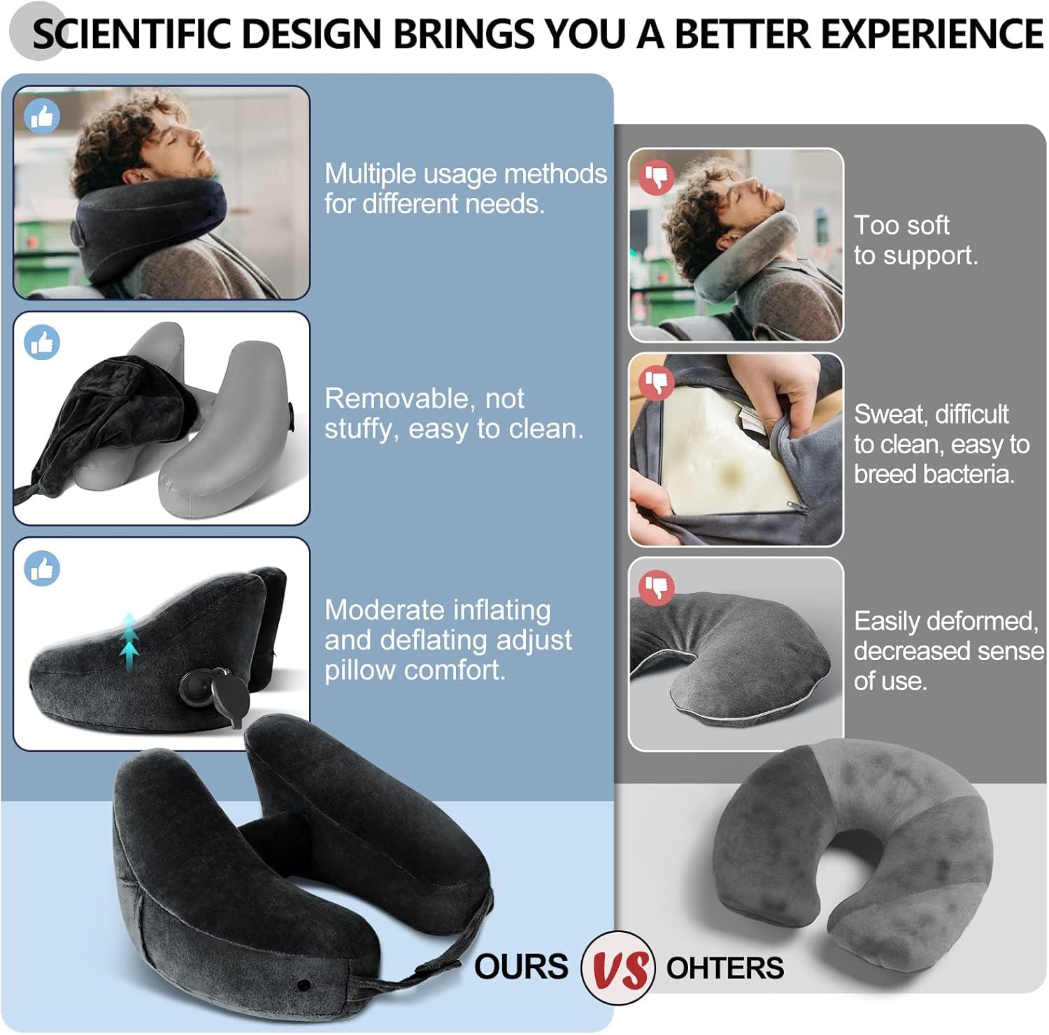 【Fast Inflating】 The neck pillow can be inflated in just 3 seconds without embarrassing moments in commun. The patented clapet retains air for a spacieux time and ensures that the cushion does not leak. The travel neck pillow is the most comfortable when inflated to 80-90%.