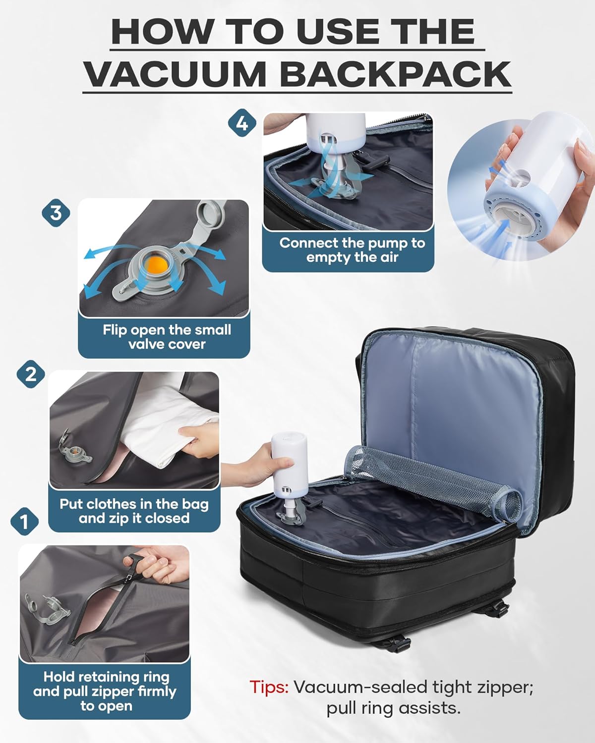 【Vide Tassement Backpack】SZLX travel backpacks are equipped with a vide pressage function that allows you to expel the air inside the bag through the outlet diode, creating more storage space. You can choose our electric vide pump for quick pressage or manually press to release the air, reducing the wasted space between vide bags and maximizing space in luggage.