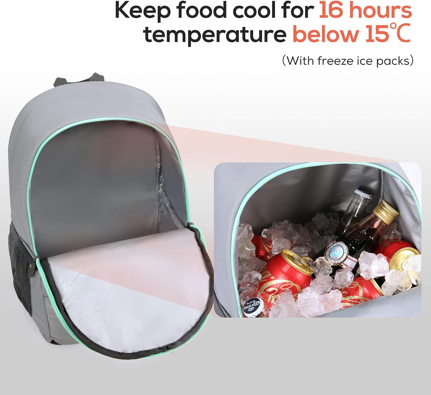 Insulation – Keep your snacks and drinks relax for 16 hours at a temperature below 15 degrees (with gel packs). A highly insulating material, PEVA, fully insulated walls and imperméable zipper seam to keep food hot or cold for several hours