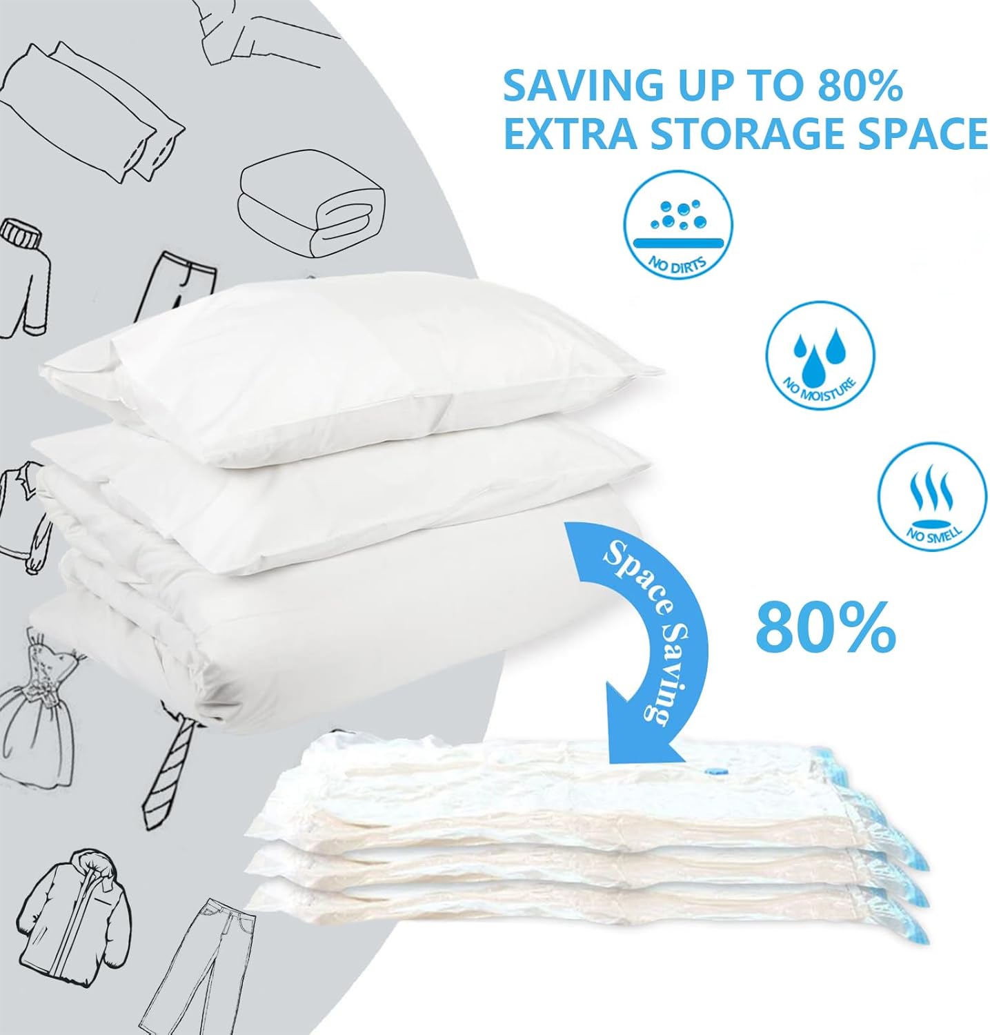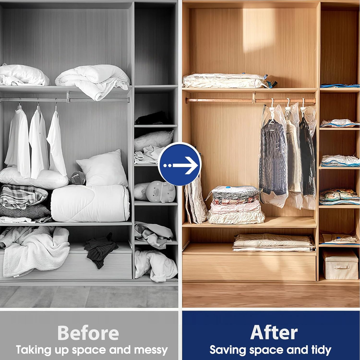 Practical and space-saving: With the vide storage bags, you can create much more space by saving up to 80% of space when storing clothes, bed linen, duvets or seasonal clothes, which is an ideal conclusion to save space in your wardrobes, cupboards and suitcases
