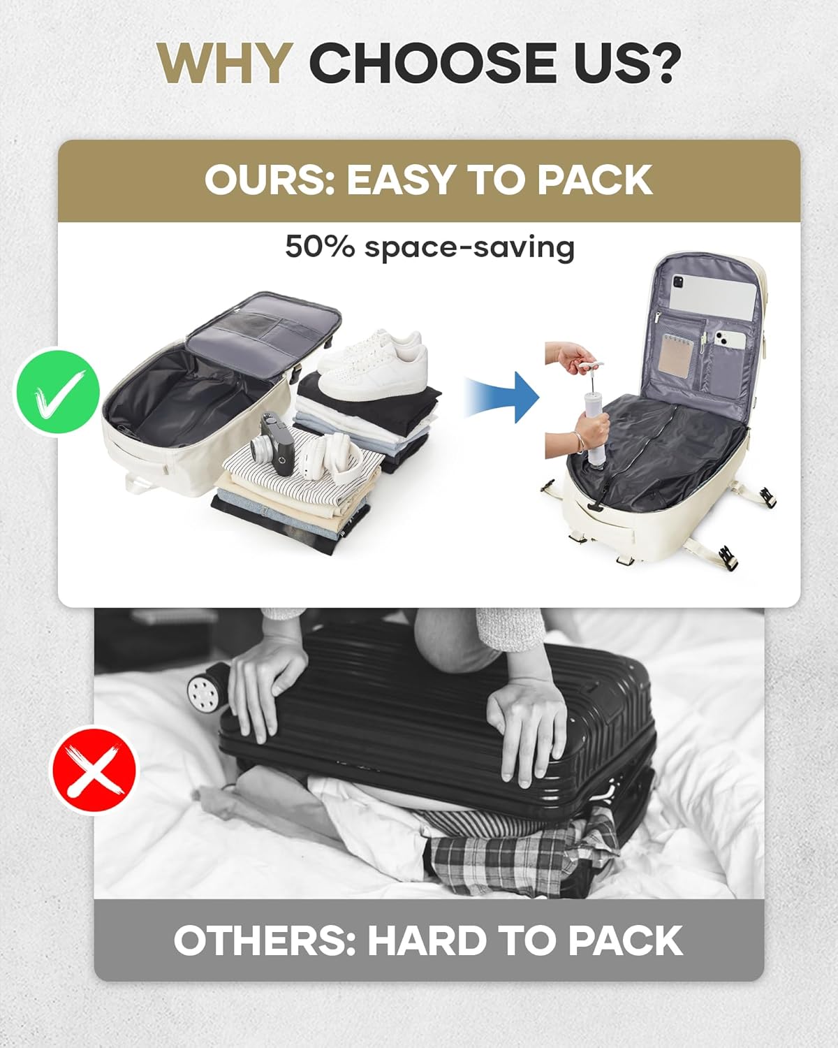 💎 Manual Vide Pump – This backpack comes with a transférable manual vide pump, easy to carry. Whether you need to quickly compress your belongings or adjust the space, it allows you to have your hands free and organize your items effortlessly.