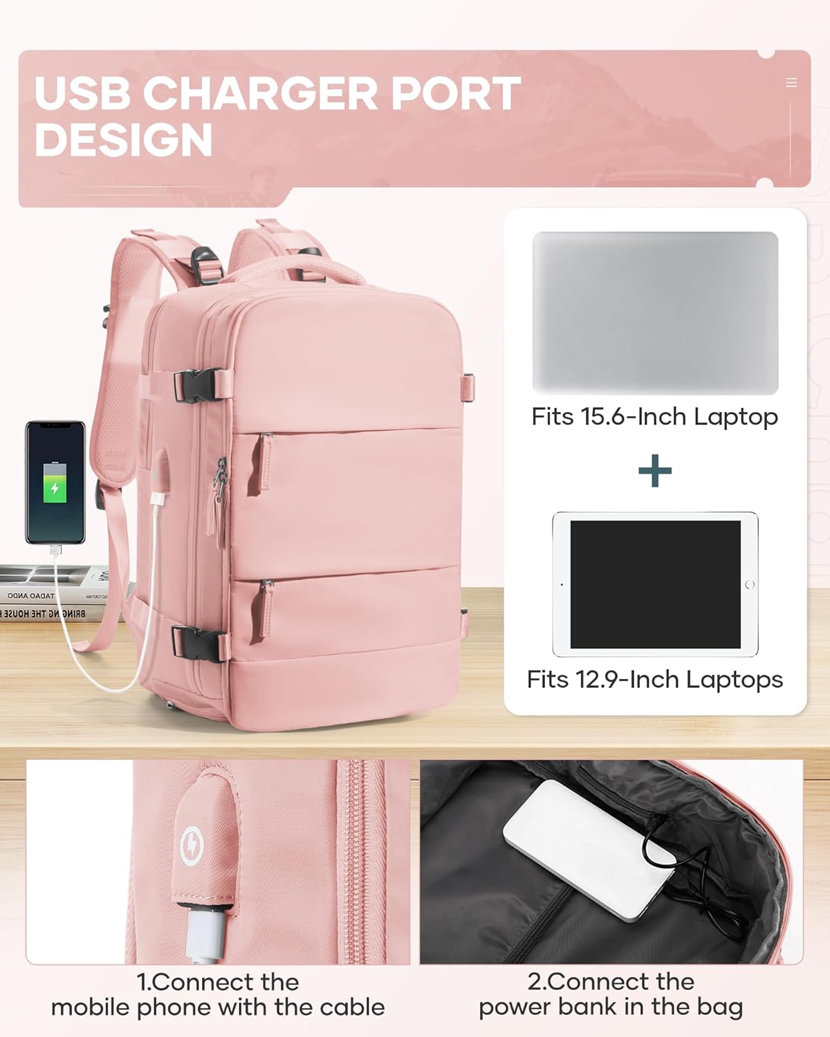 Abondant capacity bags: The size of this backpack is 47 x 33 x 20 cm. The other small pockets of the backpack are very suitable for storing water bottles, umbrellas or other small items that are easily rationnel. There is also a hidden anti-theft zipper pocket on the back of the backpack to prevent your valuables from being stolen. In calcul, it meets airline carry-on requirements and helps you save airline check-in fees.
