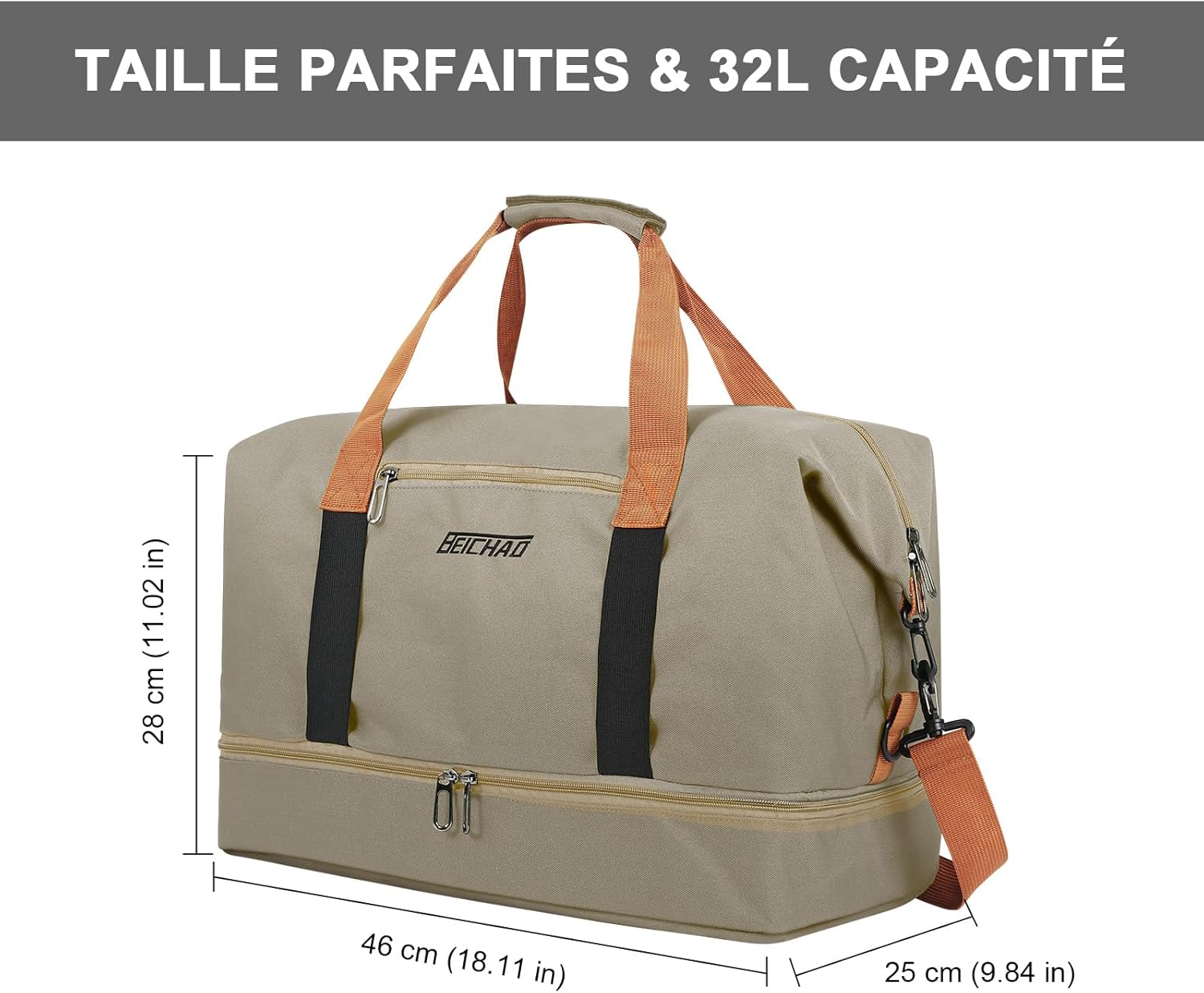 32.2 L délassements bag with wet compartment. Size: 46 x 25 x 28 cm. The abondant storage space of the adult unisex gym bag can accommodate 3-5 days of travel clothes to meet daily travel. The inner zip pocket is ideal for toiletries or wet towels.