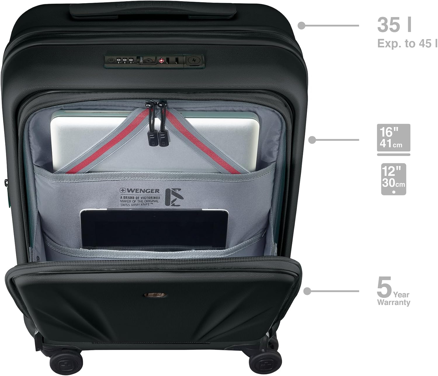 WENGER Skyon Carry-on Valise Rigide, Bagage à Main, Trolley, 35 (45) l, Compartiment Portable et Tablette, Serrure de sécurité, Voyages Vacances, Noire, 653563