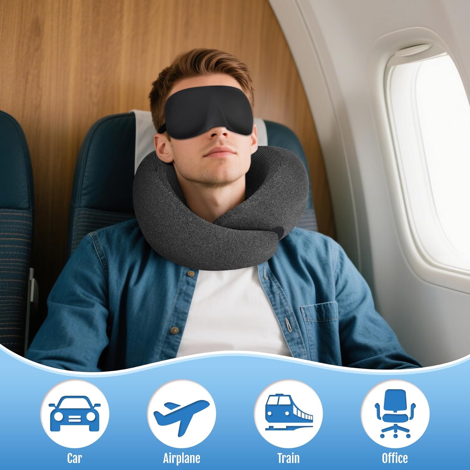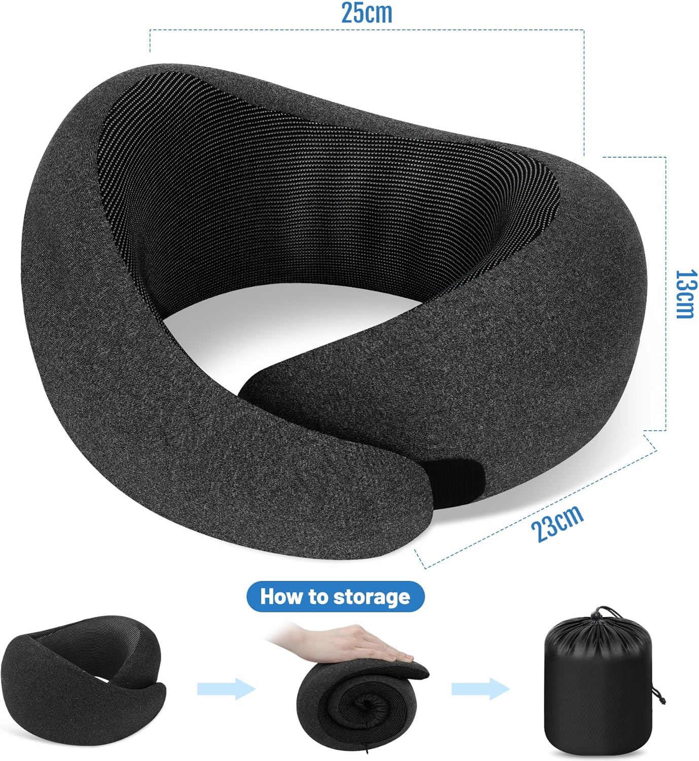 Zepphi Oreiller de Voyage 100% Mousse à Mémoire, Coussin de Nuque Ergonomique U-Shape, Sac de Transport Inclus, Bouchons d’oreille et Masque de Sommeil, Confort Avion,Voiture,Bureau,Train (Noir)